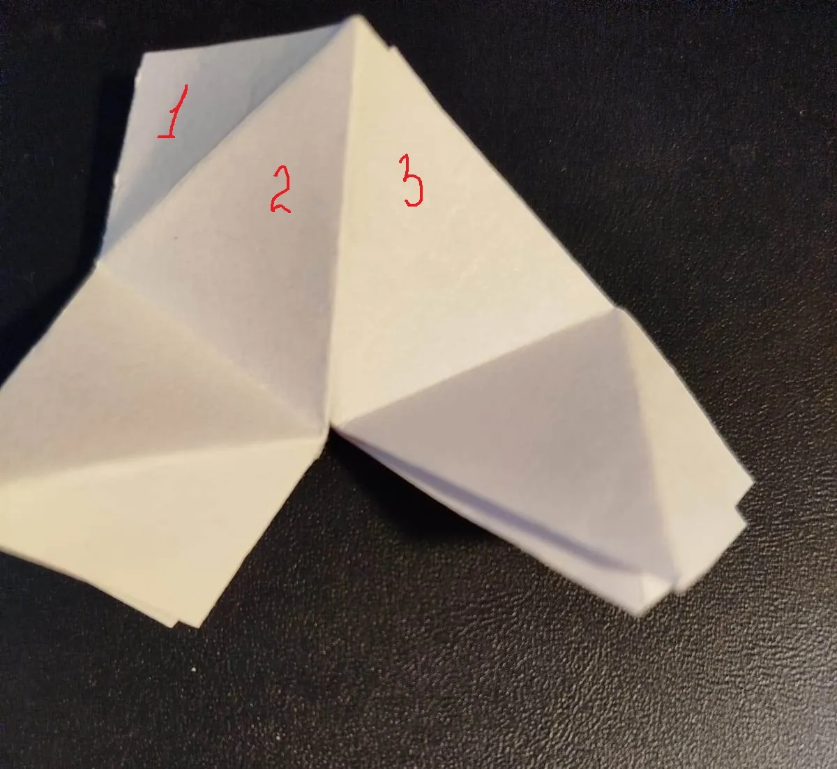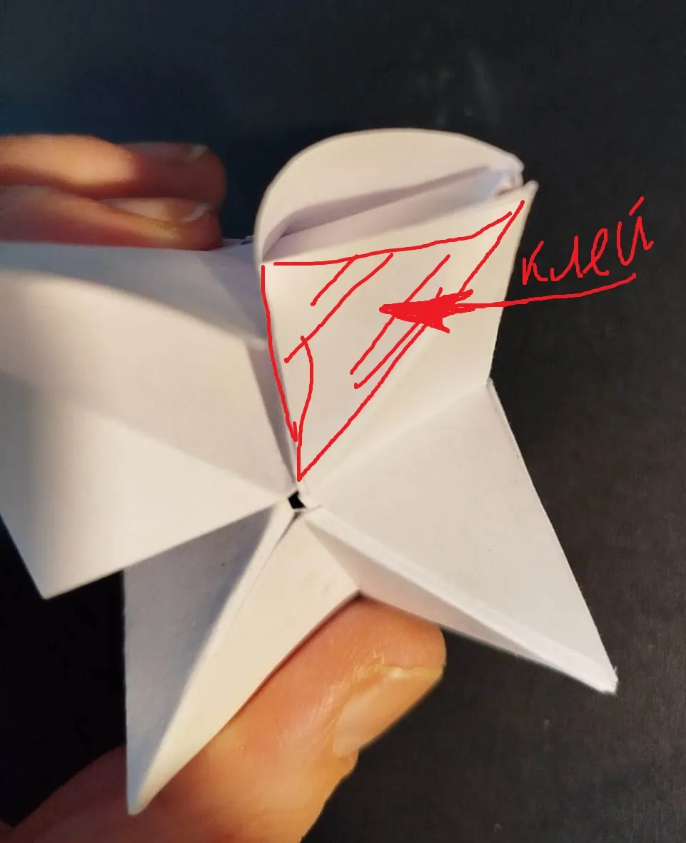 Вот к тем двум приклеиваем третью. Мажем клеем уголок и вставляем, куда показано стрелкой - получится маленькая пирамидка.