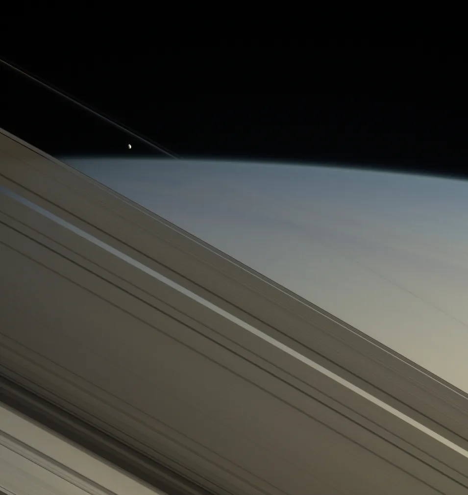 Он играет роль «пастуха» — не позволяет крайним частицам кольца уходить от него в стороны, поддерживая форму колец и щели. Снимок межпланетной станции «Кассини».