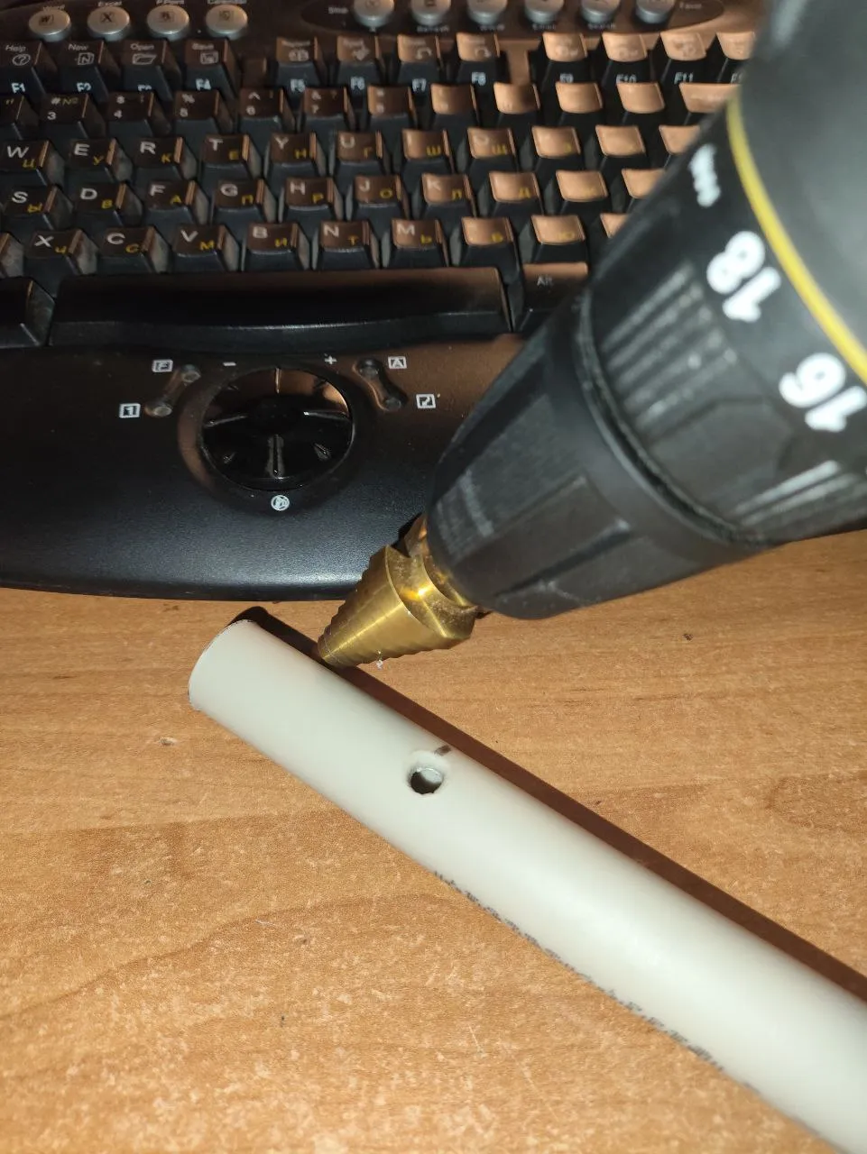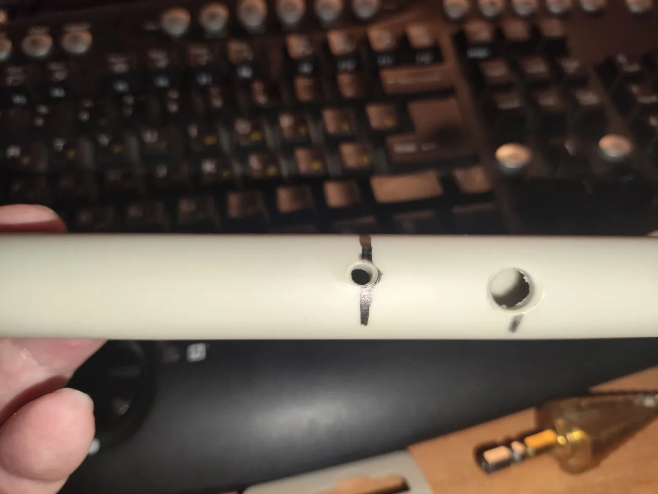 В крышке ковыряю два отверстия под контакты. Вернее под провода контактов: