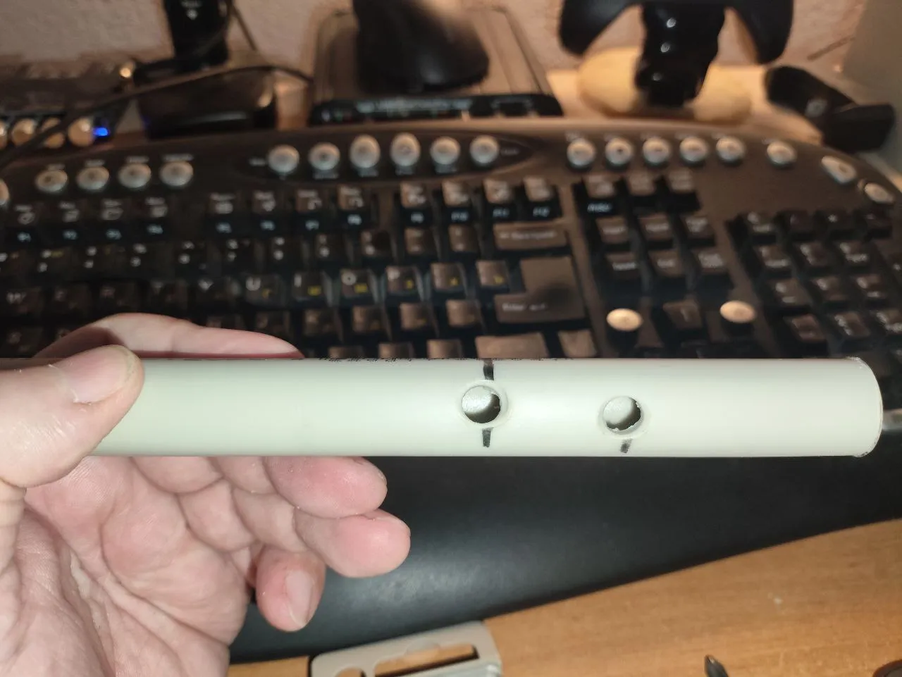 Приклеиваю и блямбу и загогулину к удлинителю двухсторонним скотчем: