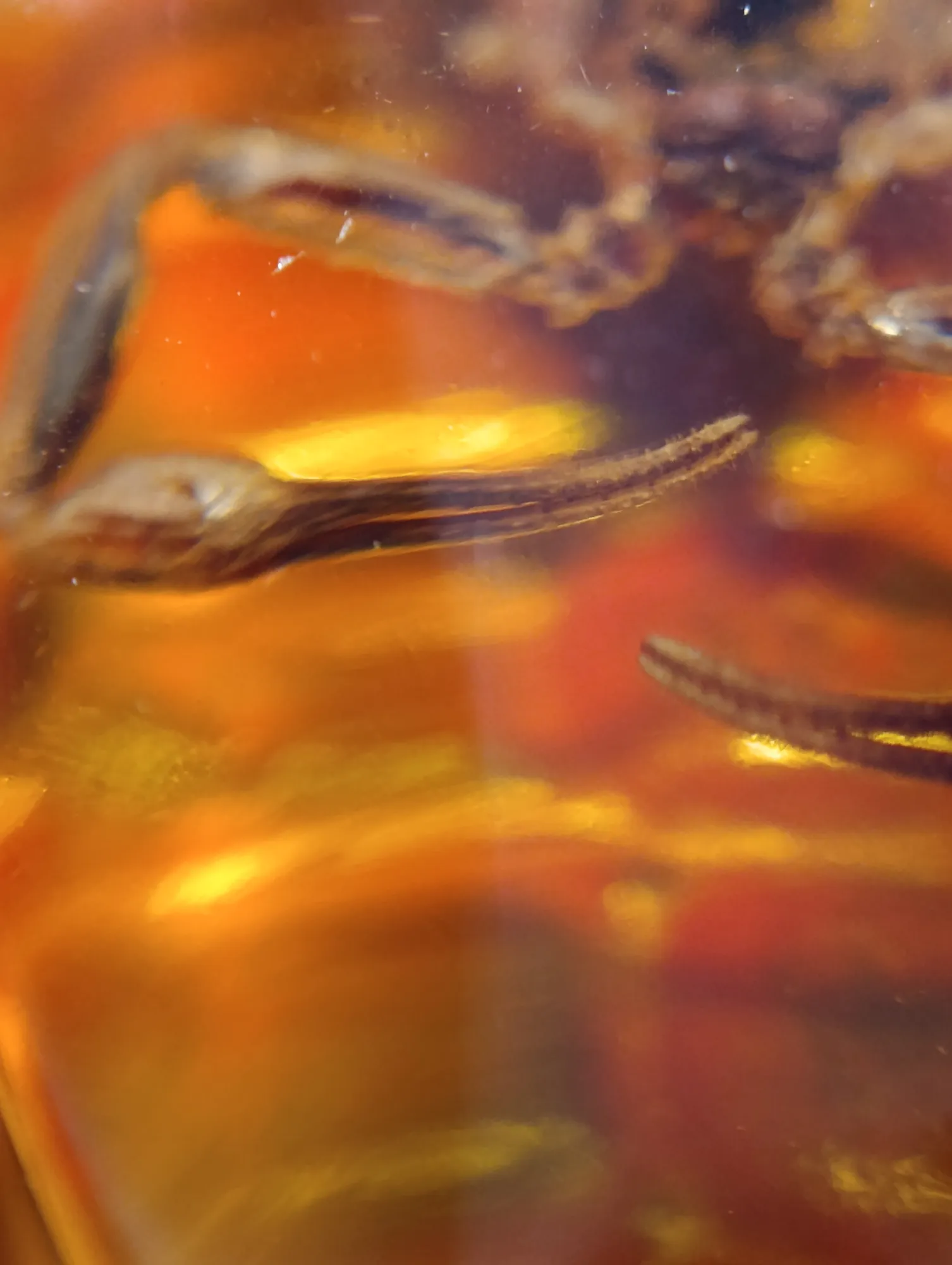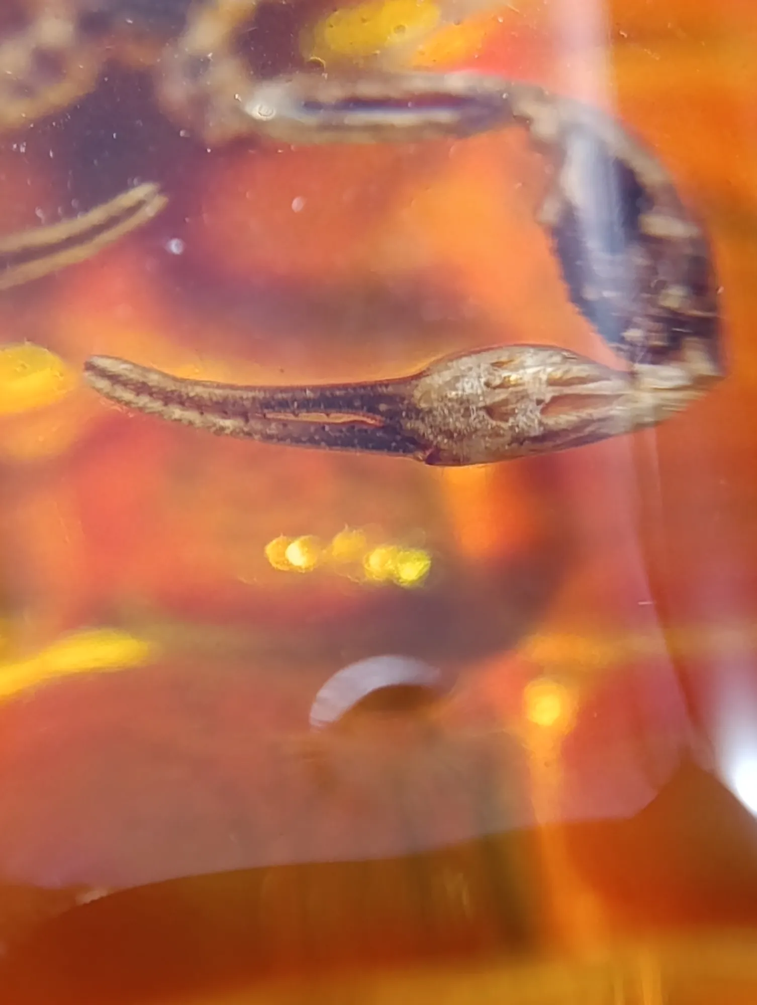 На небольшой голове расположены небольшие трёхчлениковые антенны, фасеточные глаза и хоботок (рострум), которым они ловко орудуют. Он длинный, острый и очень мощный. Используется для прокалывания панциря или кожи добычи и высасывания ее внутренних жидкостей. Это их "шприц" для обеда (уж поверьте, вы бы ни за что не захотели оказаться в списке его гастрономических предпочтений)