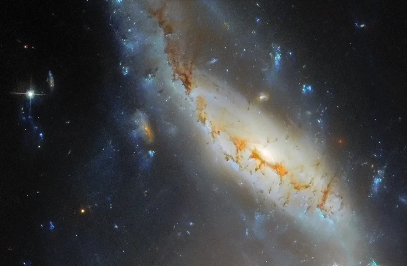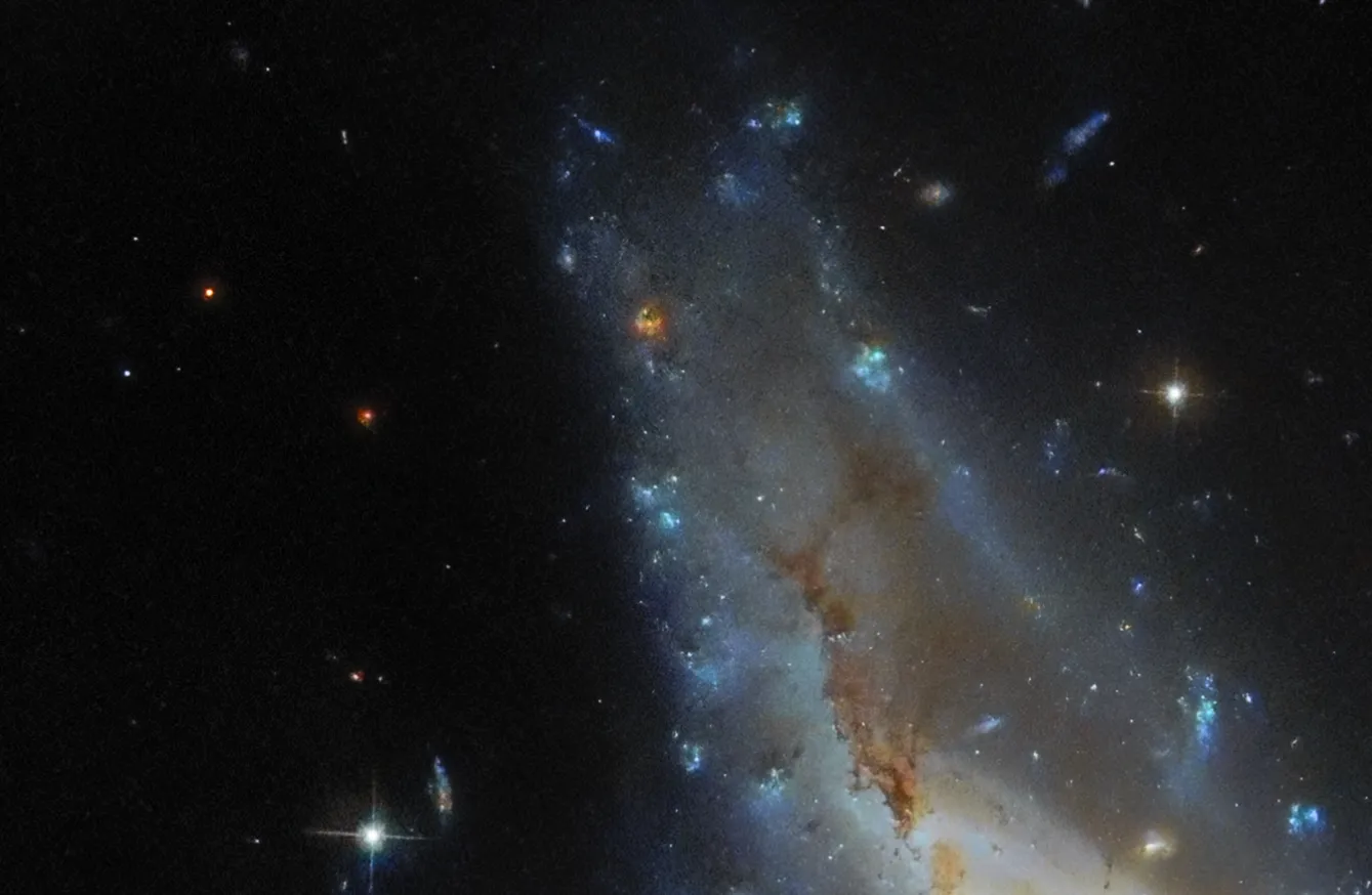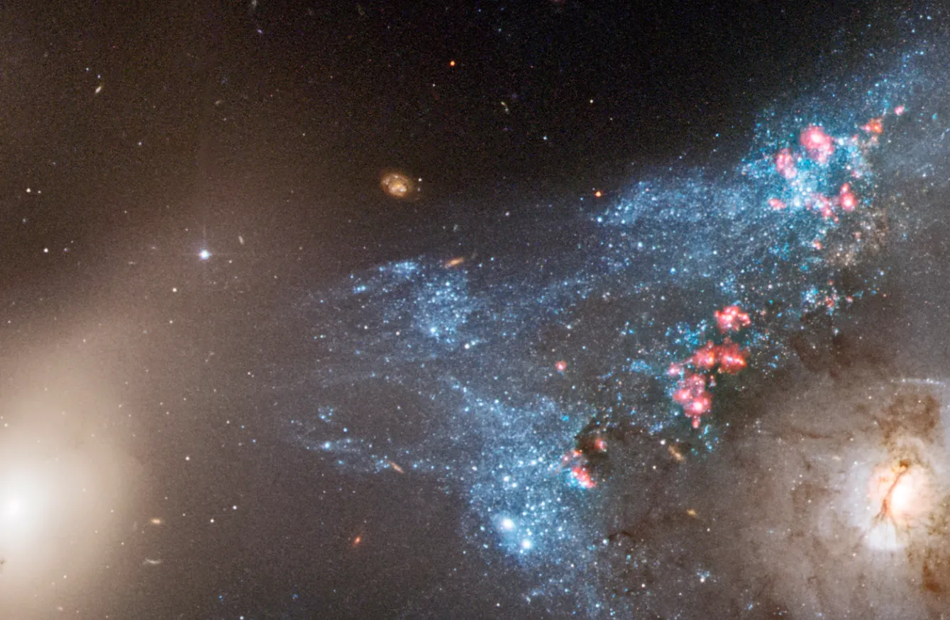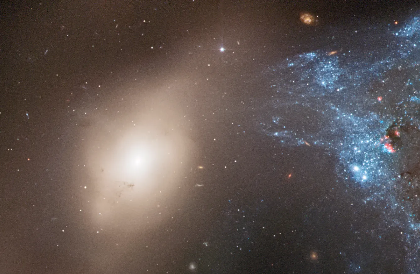 Фотография от «Хаббла» показывает необычную систему Arp 122, которая на самом деле состоит из двух сталкивающихся галактик: наклонённой и искажённой спиральной галактики NGC 6040 и круглой спиральной галактики LEDA 59642, видимой анфас. Это космическое столкновение происходит на расстоянии около 570 миллионов световых лет от Земли. В углу снимка видна эллиптическая галактика NGC 6041 — центральный член скопления, в котором находится Arp 122, но она не участвует в этом слиянии.