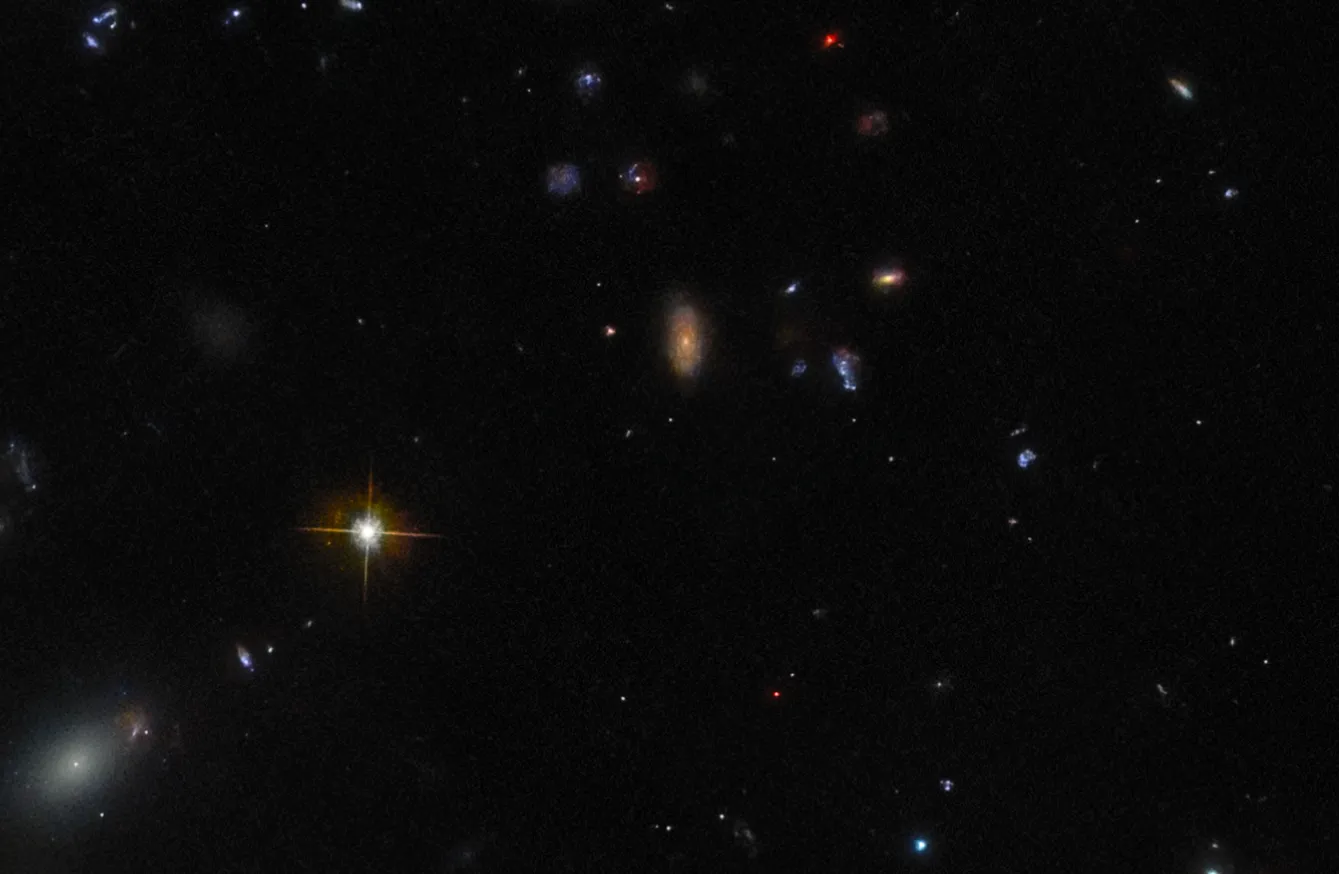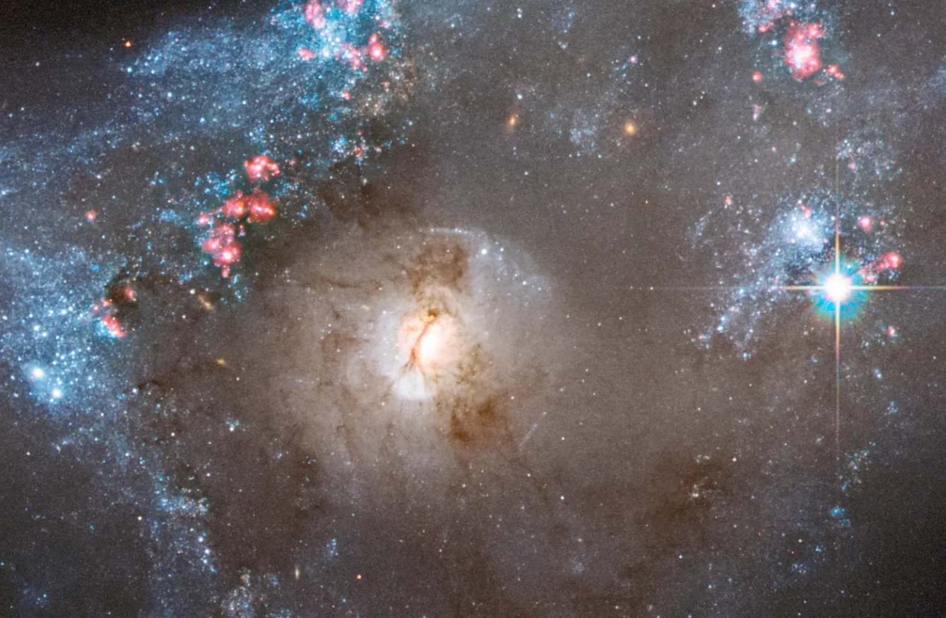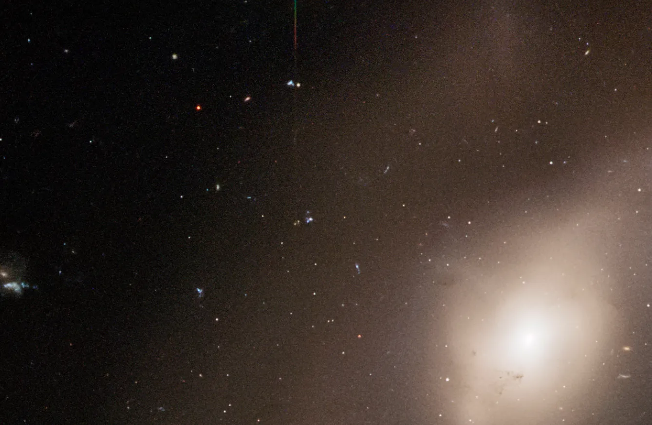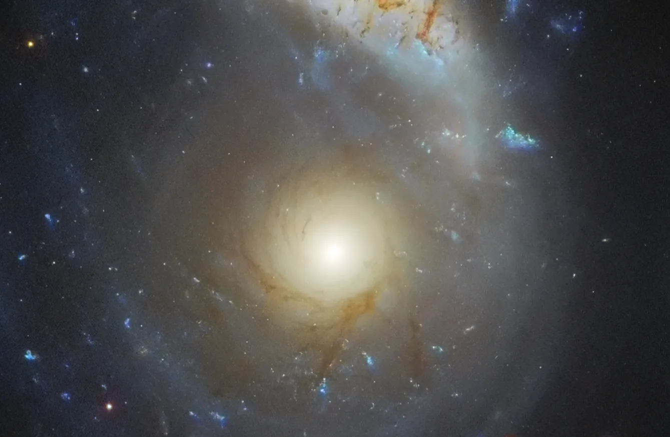 Фотография от «Хаббла» показывает необычную систему Arp 122, которая на самом деле состоит из двух сталкивающихся галактик: наклонённой и искажённой спиральной галактики NGC 6040 и круглой спиральной галактики LEDA 59642, видимой анфас. Это космическое столкновение происходит на расстоянии около 570 миллионов световых лет от Земли. В углу снимка видна эллиптическая галактика NGC 6041 — центральный член скопления, в котором находится Arp 122, но она не участвует в этом слиянии.