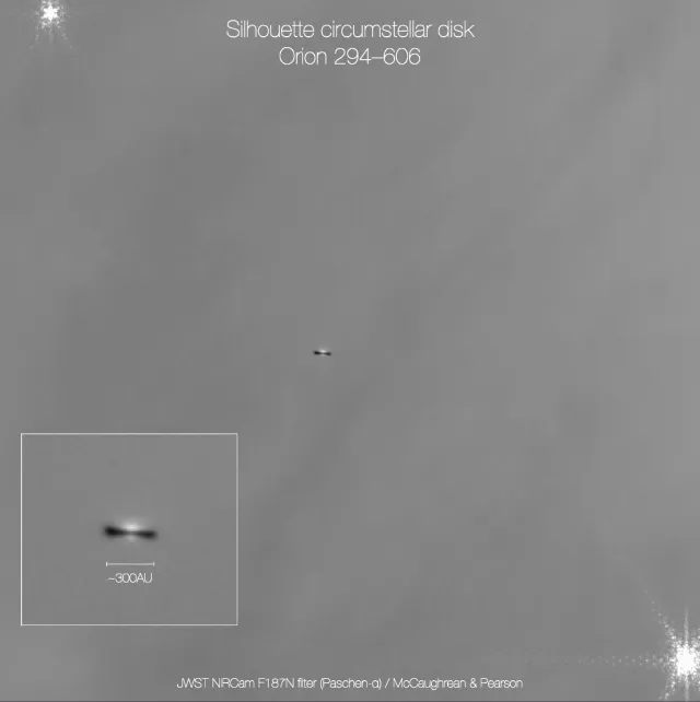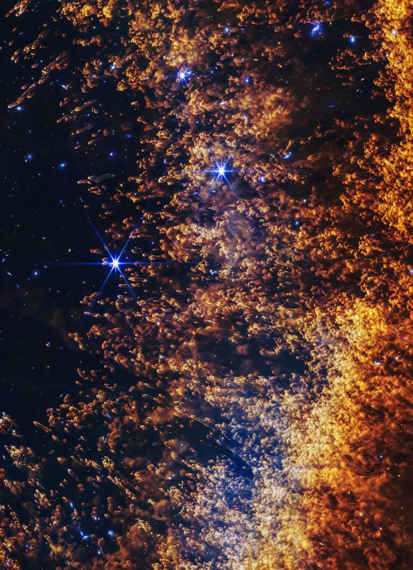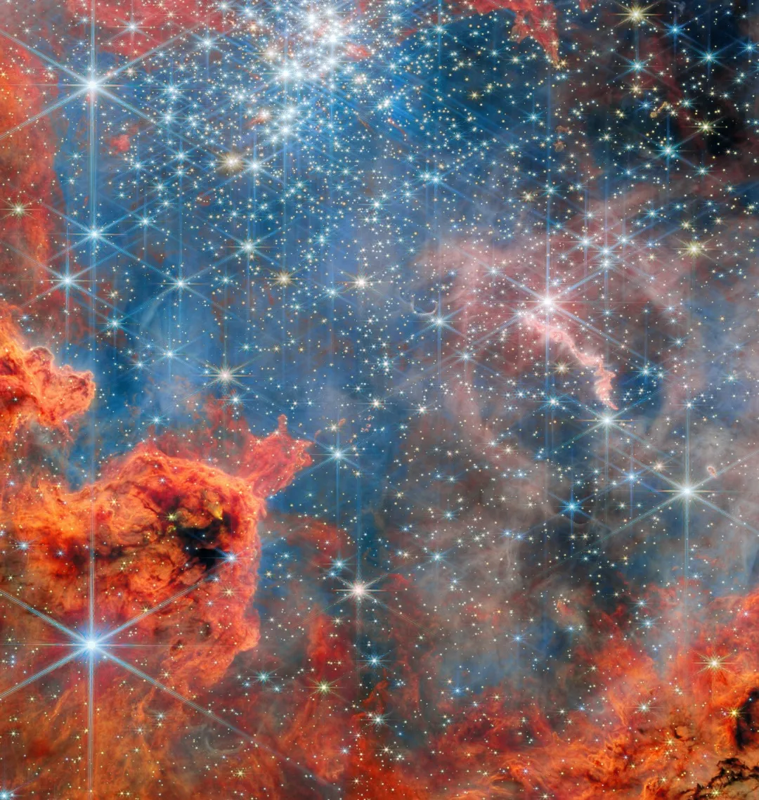 На представленном здесь снимке облака 2S «Уэбб» показал яркое центральное скопление, состоящее из новорождённых звёзд. Некоторые из этих молодых светил испускают протяжённые струи вещества со своих полюсов. Справа вверху от основного скопления видно вторичное, меньшее звёздное скопление - его существование учёные ранее лишь предполагали, но теперь оно подтверждено снимками телескопа. Кроме того, «Уэбб» раскрыл «глубинный океан» фоновых галактик и красноватых туманных структур, которые буквально выдуваются и вырезаются звёздными ветрами и излучением соседних звёзд.