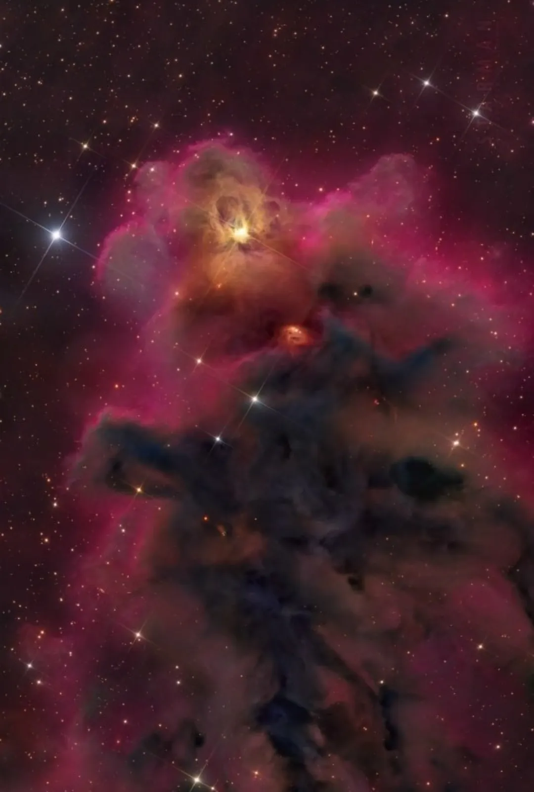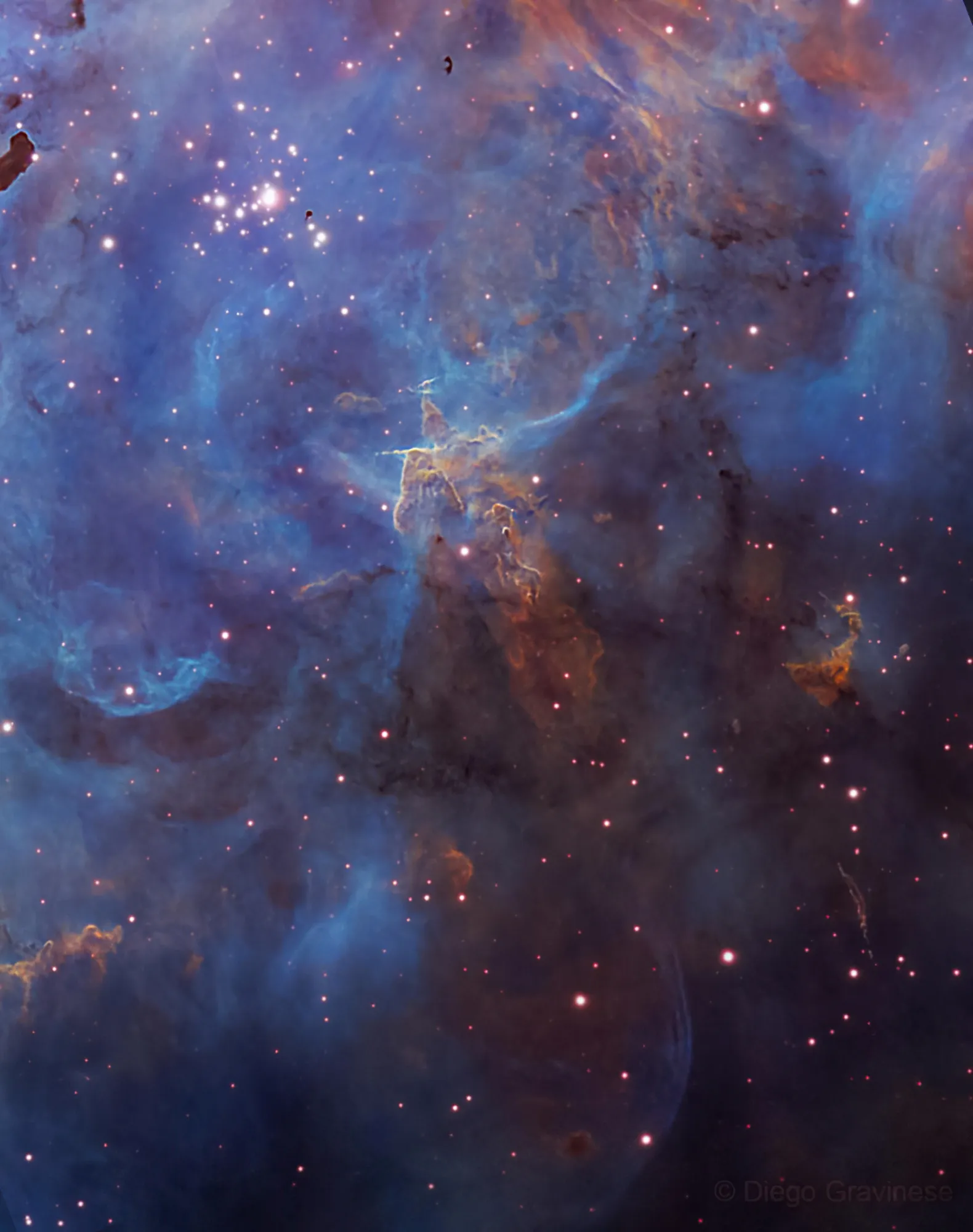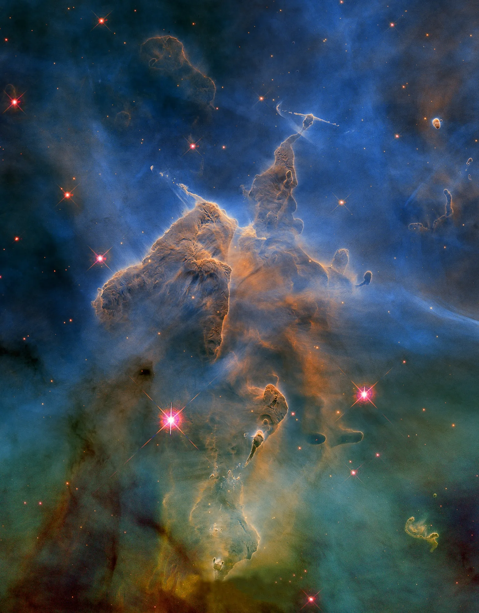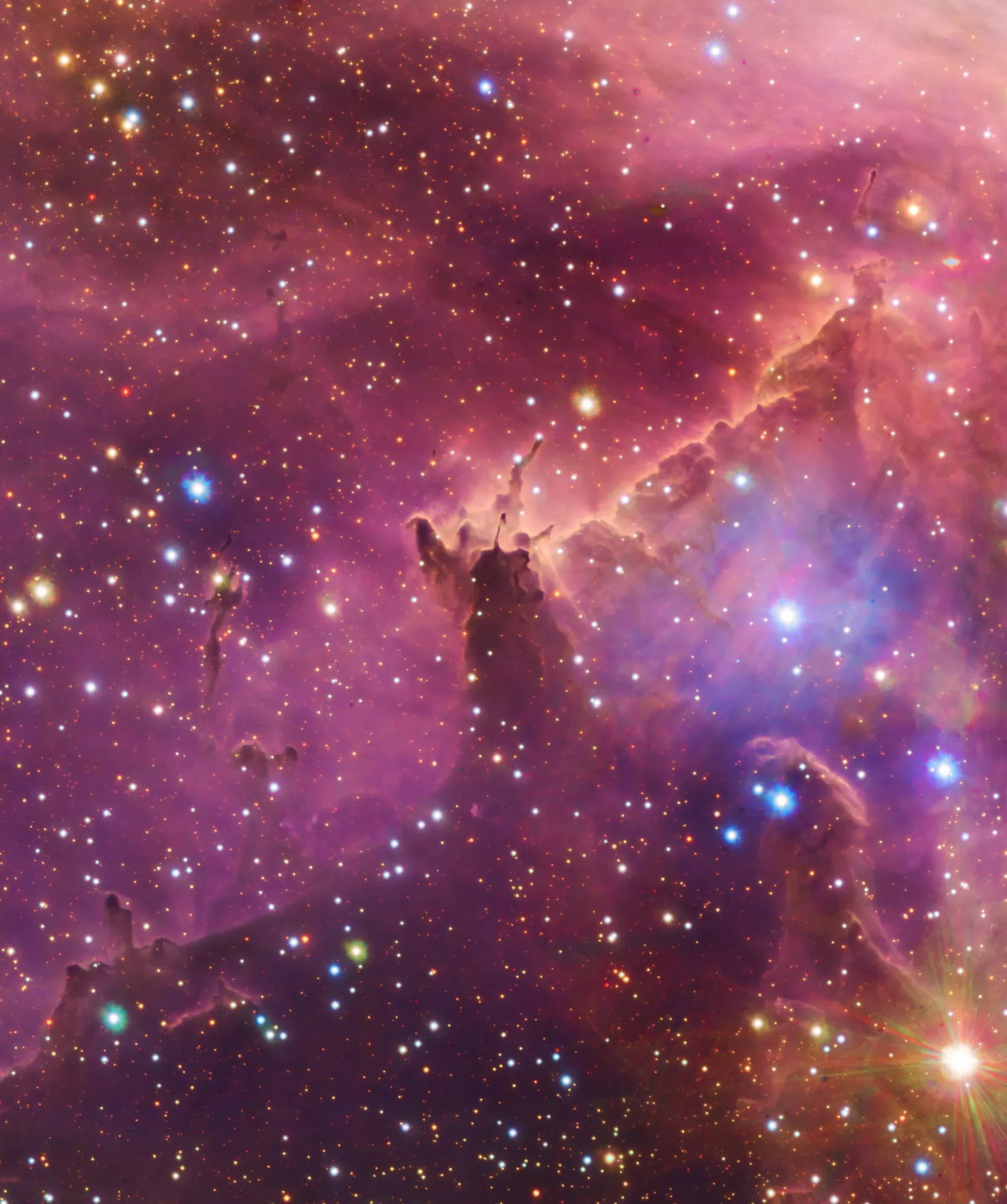 Эти плотные облака газа и пыли находятся в туманности Бегущего Цыпленка или IC2948 в созвездии Центавра — одной из областей звездообразования в Млечном Пути. Газ в туманности ионизируются излучением от молодых звезд, которое также, вместе со звездными ветрами, и придает причудливую форму плотным облакам, постепенно разрушая их. Снимок охватывает зону площадью менее трети диска полной Луны и получен обзорным телескопом VST в Чили.