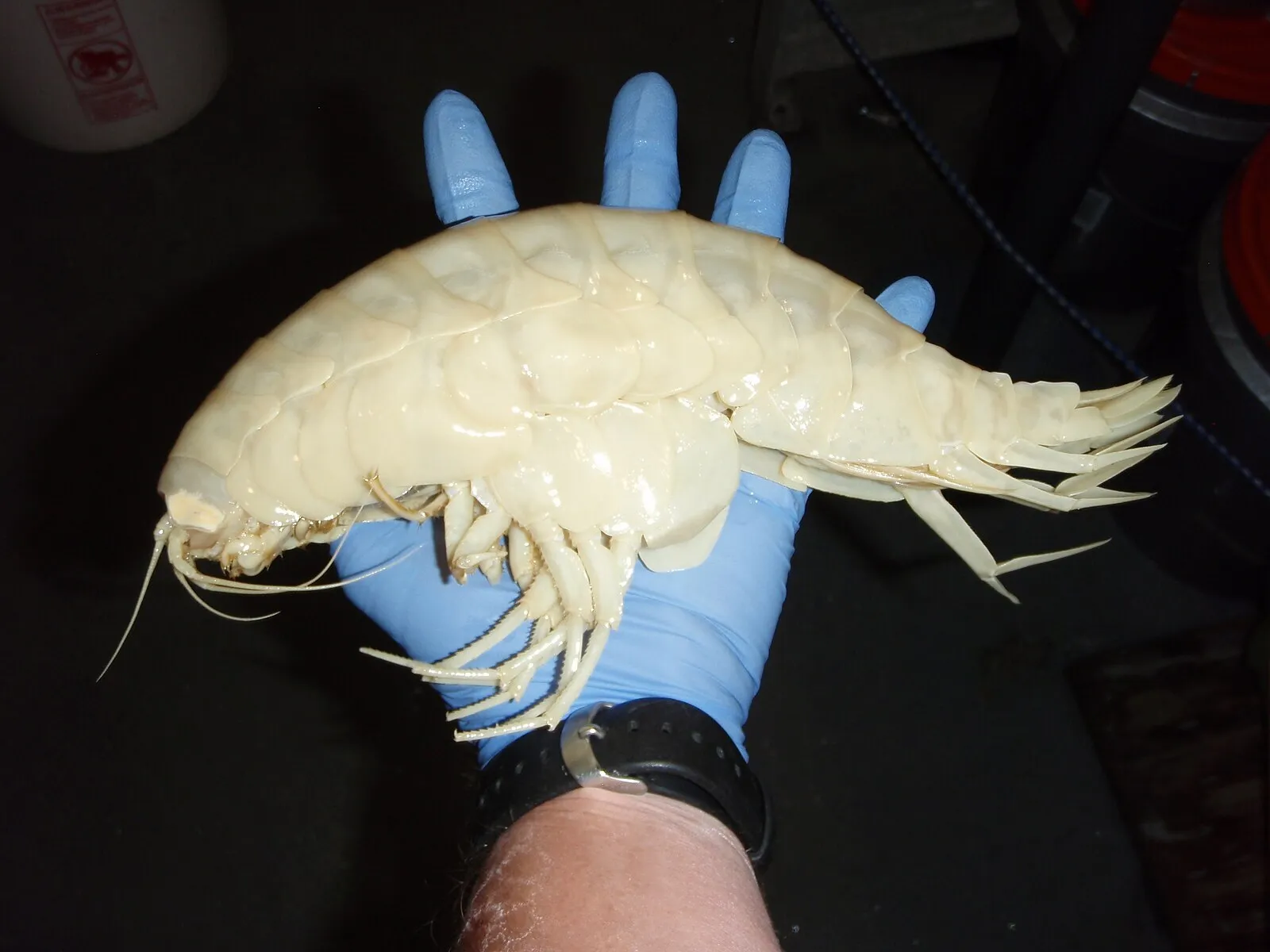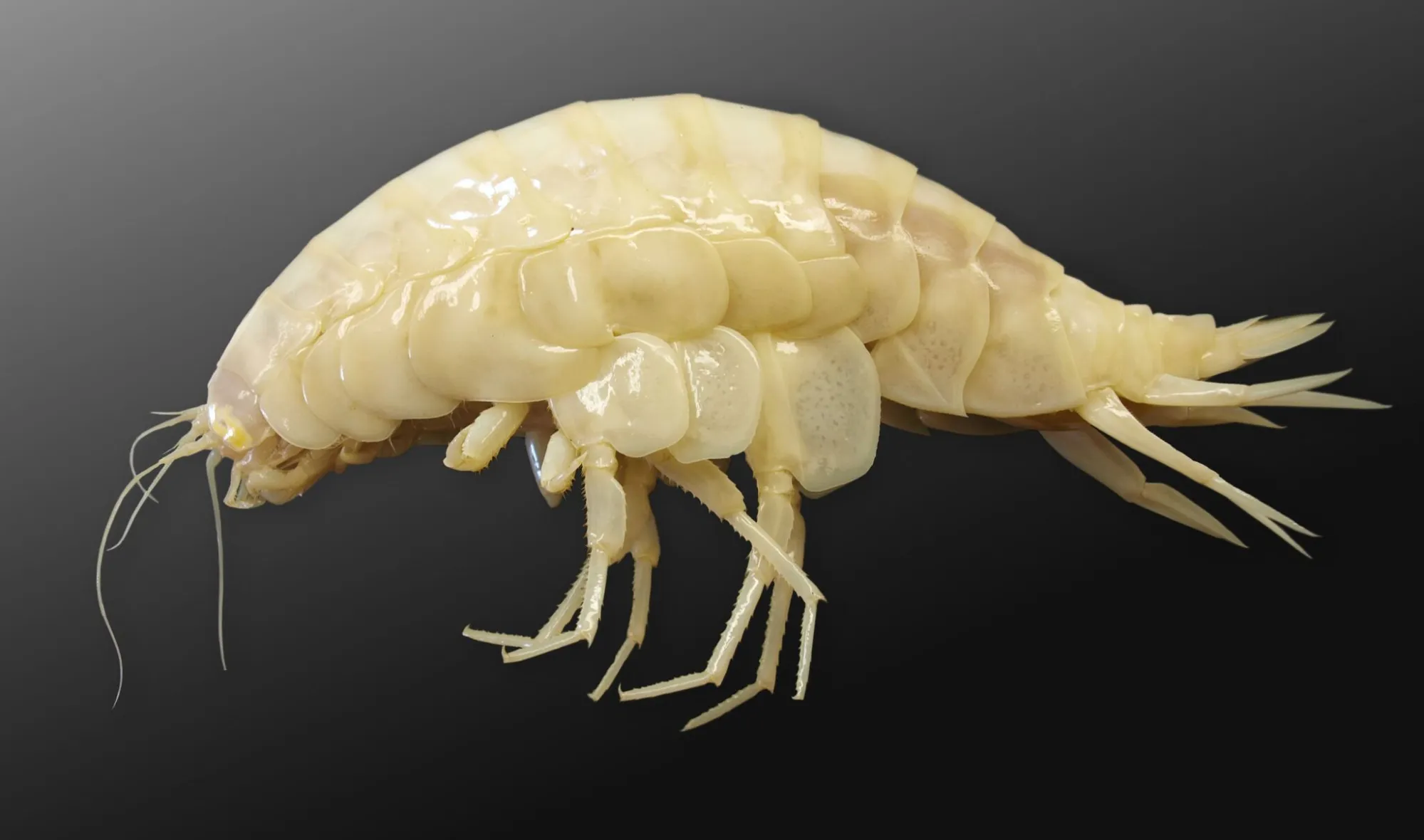 Что же представляет из себя этот огромный кревет? Самые крупные экземпляры могут вырастать до 34 см в длину, что согласитесь, звучит довольно внушительно. Окраска у них обычно белая, реже кремовая или полупрозрачная, поскольку на глубине нет света и понтоваться крутыми расцветками просто бессмысленно. Единого панциря у этого ракообразного нет, он разделён на множество хитиновых сегментов, что значительно повышает подвижность и при этом обеспечивает защиту.