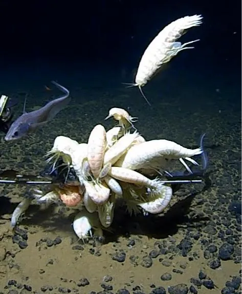 Еще один, не такой постоянный, но наиболее желанный источник пищи на морском дне - трупы крупных животных. Когда на дно опускается туша кита, рыбы или другого крупного животного, это становится настоящим пиршеством для обитателей непроглядной морской бездны. Наш гигантский бокоплав, благодаря своим размерам и сильным челюстям, может эффективно использовать такие ресурсы, набивая себе брюхо сочной мертвечинкой.