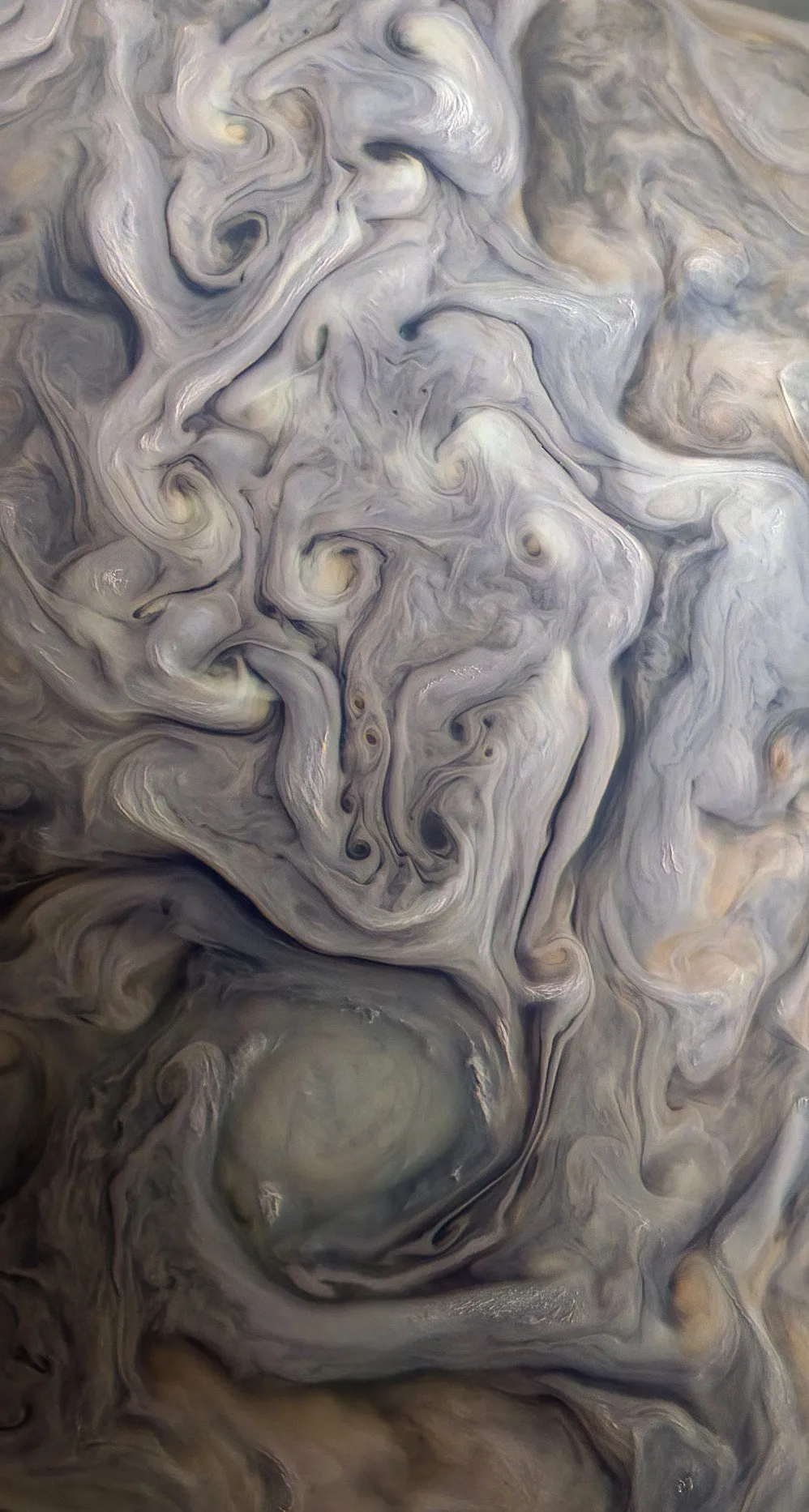 Снимок показывает различия в составе и отражательной способности облаков в широтных поясах газового гиганта, а также красноватую дымку, укрывающую оба полюса планеты. Можно также заметить знаменитый, огромный и долгоживущий антициклонический вихрь Большое Красное Пятно, которое выглядит очень темным из-за частиц дымки на больших высотах, которые активнее поглощают ультрафиолетовое излучение, чем дымка на полюсах.