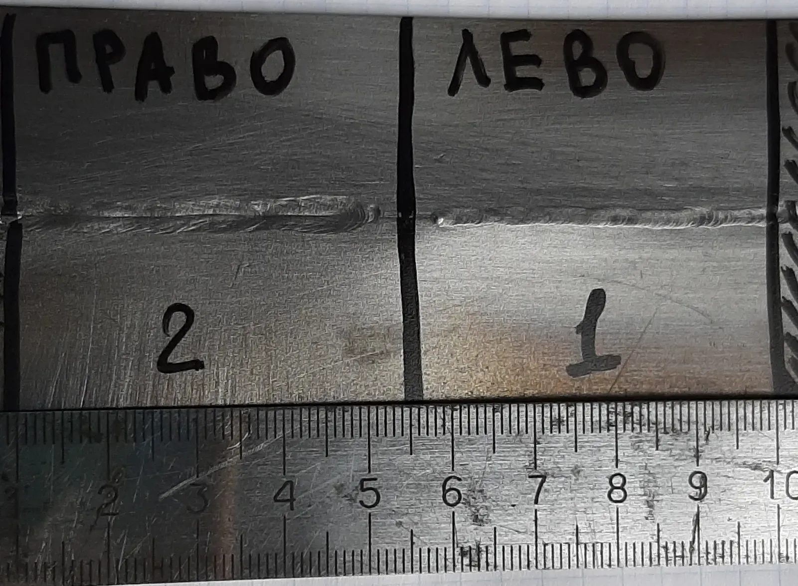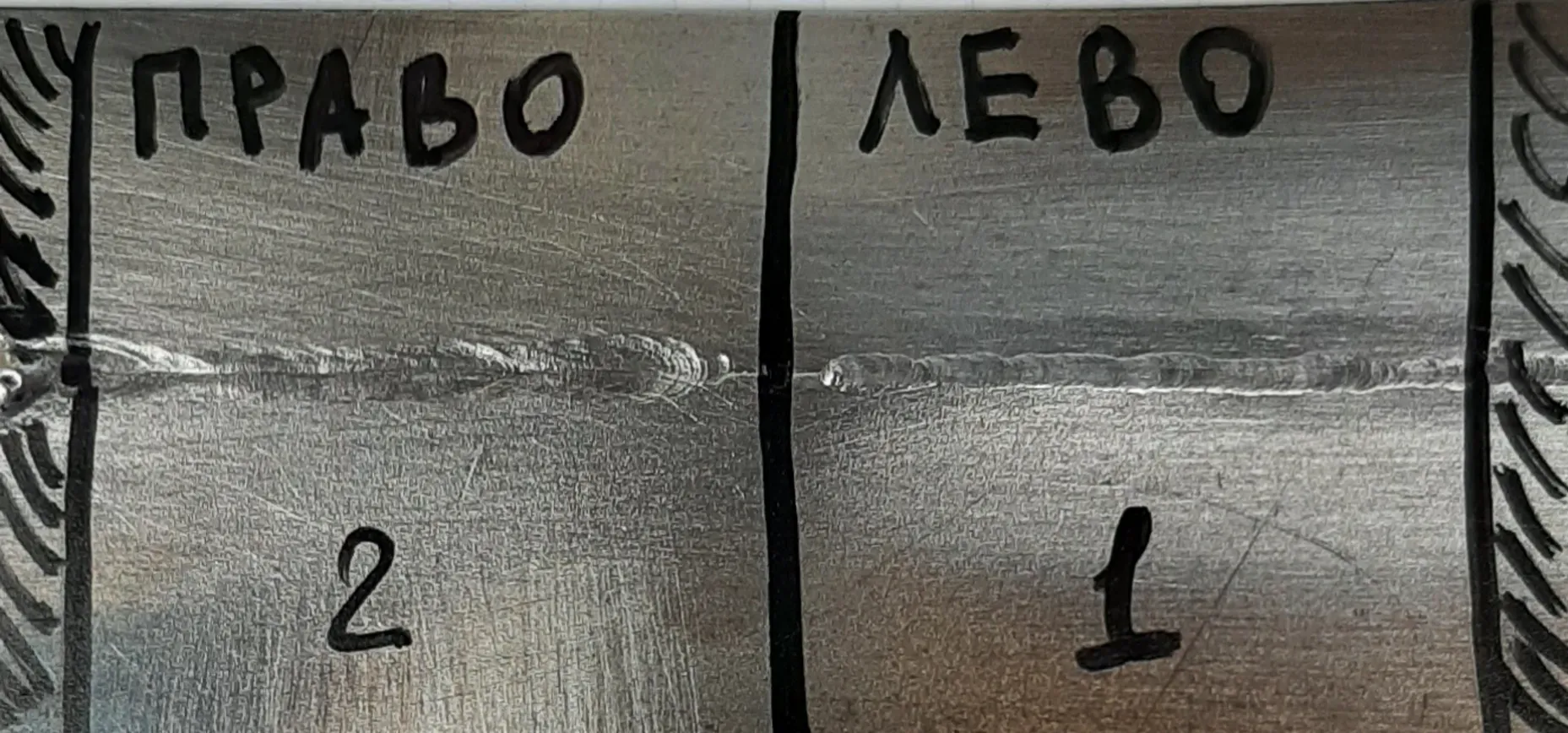 Объясню почему так: токи на обоих образцах были одинаковы, все режимы идентичны, но на образце под номером 2, была широкая, гуляющая дуга и сварщику было тяжело поймать её на стыке двух пластин, поэтому случился перегрев, провал, фиаско, ебля гусей, ширина выше допустимой и вообще шов говно - на вырез. А слева сварщик имел полный контроль над грязной сучкой дугой и заварил все красиво. Вот поближе: