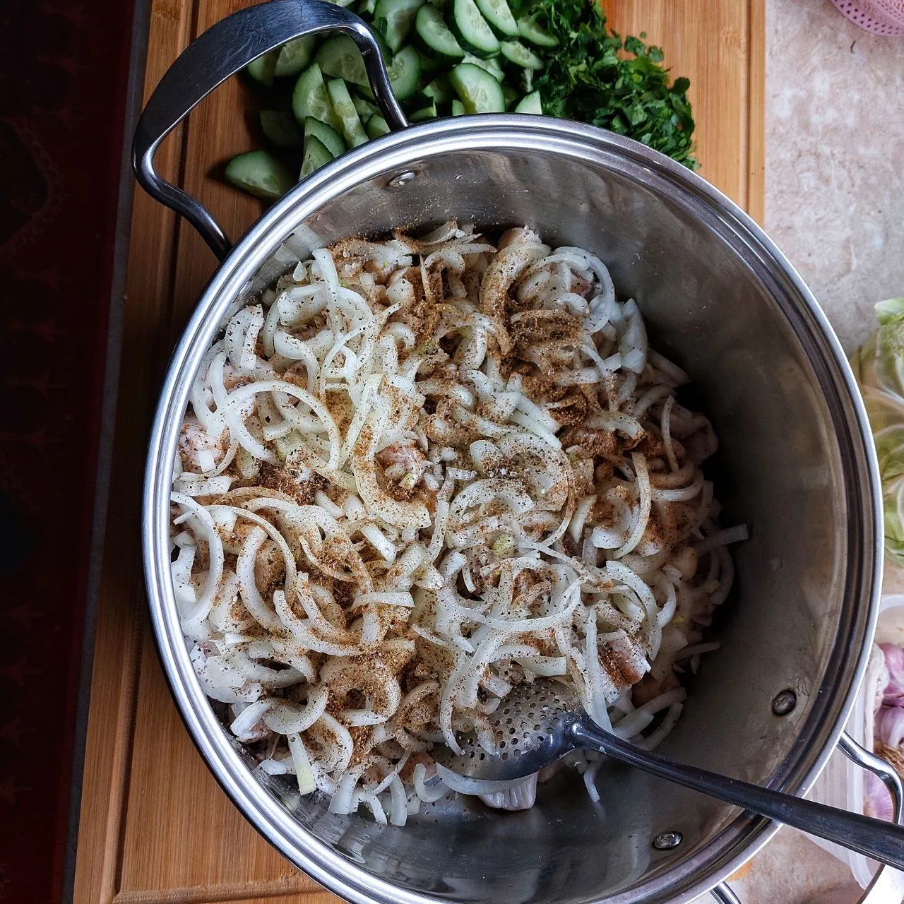 После часа маринования, не забываем слить всю жижу. Добавляем лук, кориандр и черный перчик из маленькой пиалы, перемешиваем, пусть дальше стоит.