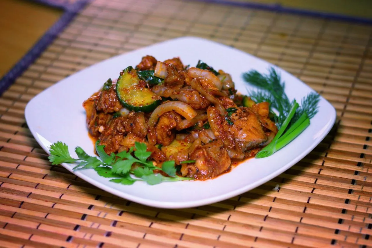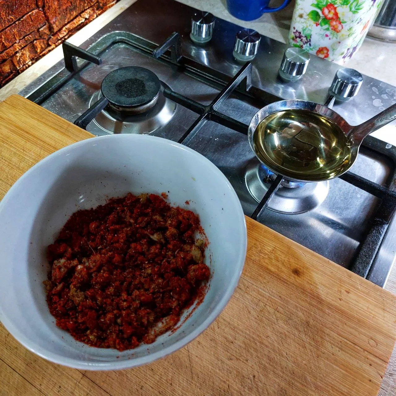 Мне не нравится мыть сковороду, поэтому традиционной корейской горки не будет, обжарим прям так. Калим масло и заливаем помешивая специи. Можно дополнительно обжарить лук, но по мне он там лишний, потому его нет.