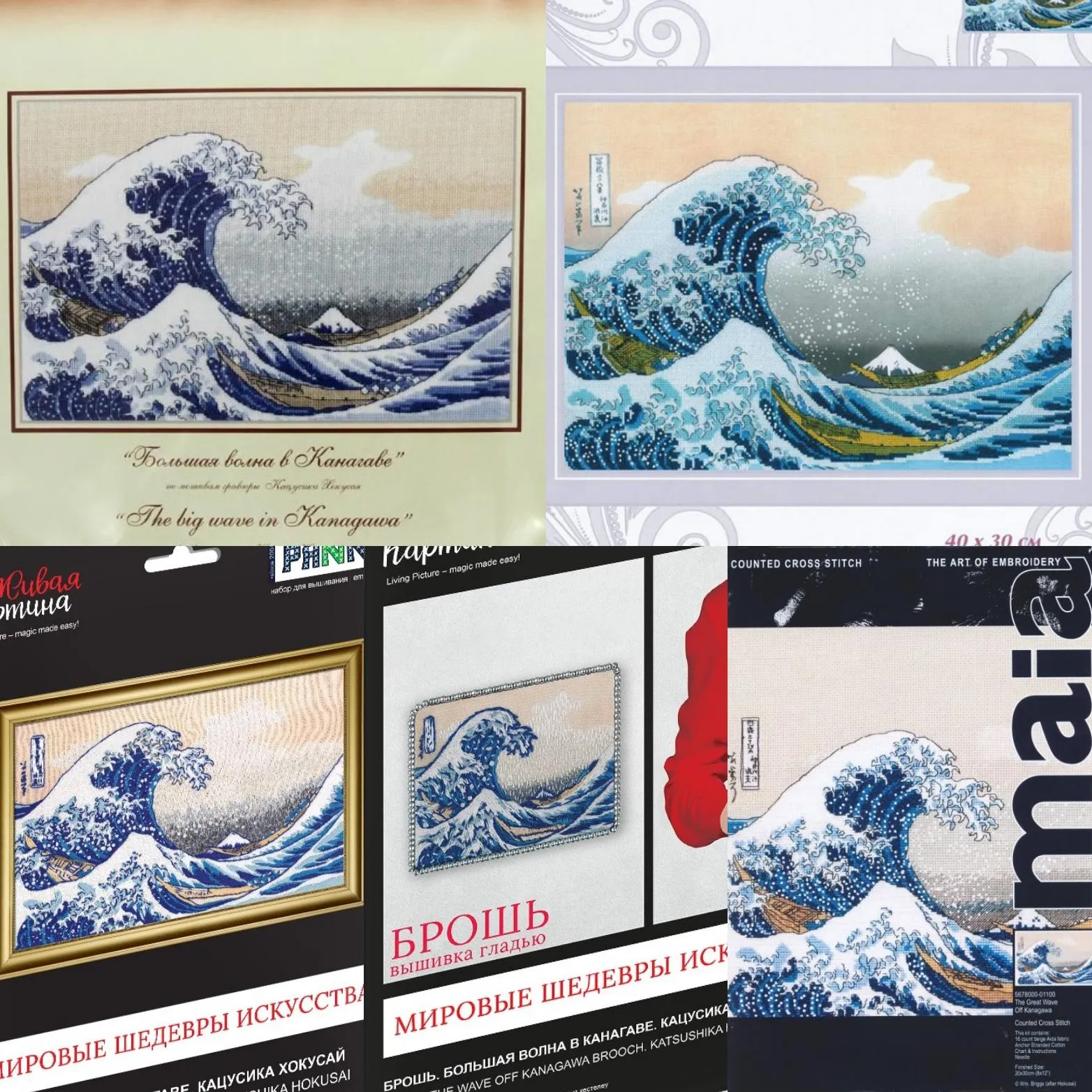 Неудивительно, что она отметилась и в вышивальном мире: наборов и схем по её мотивам существует огромное количество. На любой вкус – крестиком с полным зашивом, неполным зашивом (фон полукрестом или принтованная основа), гладью... Мой выбор в итоге пал на тот набор, что в коллаже в правом нижнем углу.
