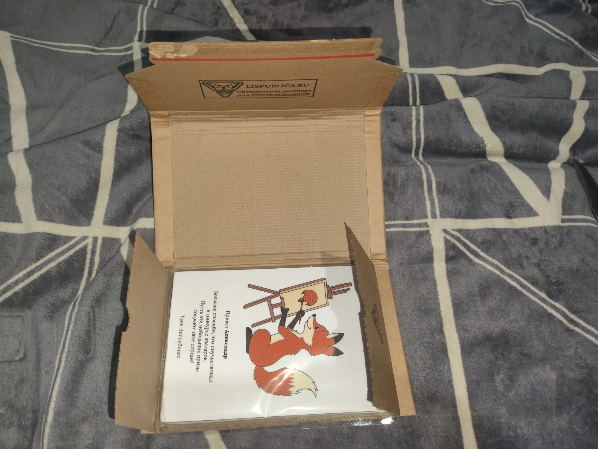 Шкодная лиса в начале поста как бы намекает, что уважаемый наш подаркодаритель решил сделать сюрприз так сюрприз, тем самым прославившись на всю страну, а вернее именно на ту её часть, где проходил путь этой посылки из Новосибирска в самый Краснодар.