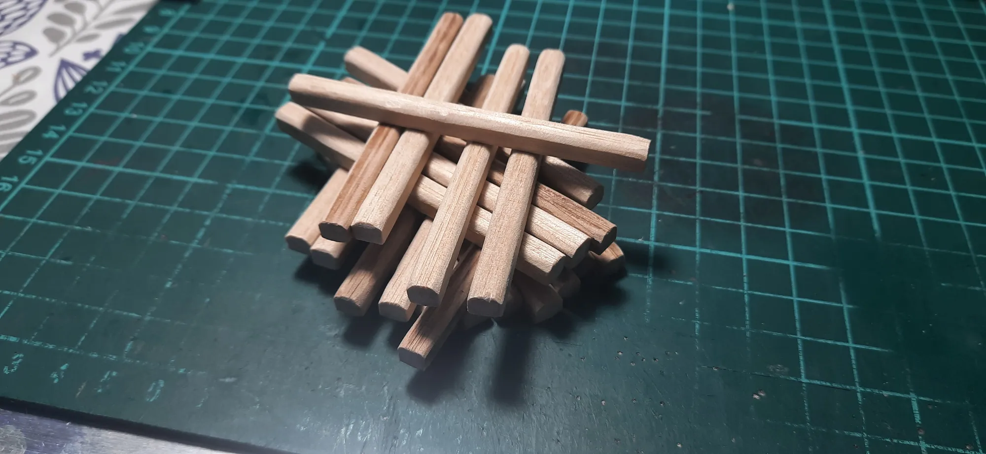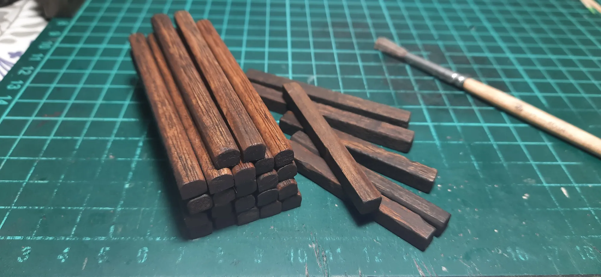 А потом просто идём в ближайший гипермаркет и покупаем...деревянные шампуры для пикника. Как выяснилось, они почти идеально подходят под размер шпалы. Если уменьшить её в 35 раз. Нам остаётся распилить шампурчики на шпалинки нужной длины, и доработать напильником!