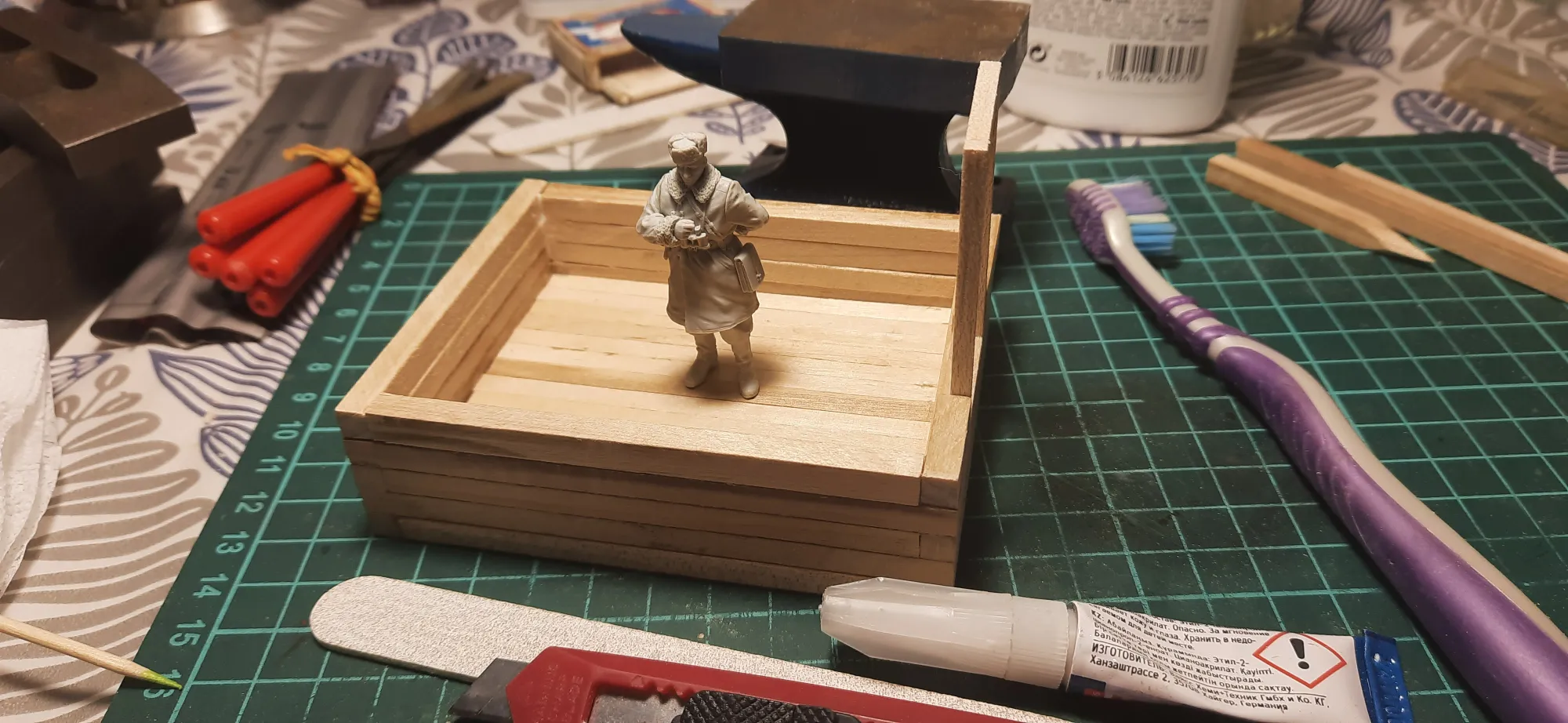 Скидаем маленький домик всё из тех же шампуров, палочек от мороженного, и реек для судомоделизма. Сделал небольшой чертёж, фундамент, расчитал масштаб. Товарищ лейтенант в зимней одёжке вполне мог бы развернуться в этой каморке.
