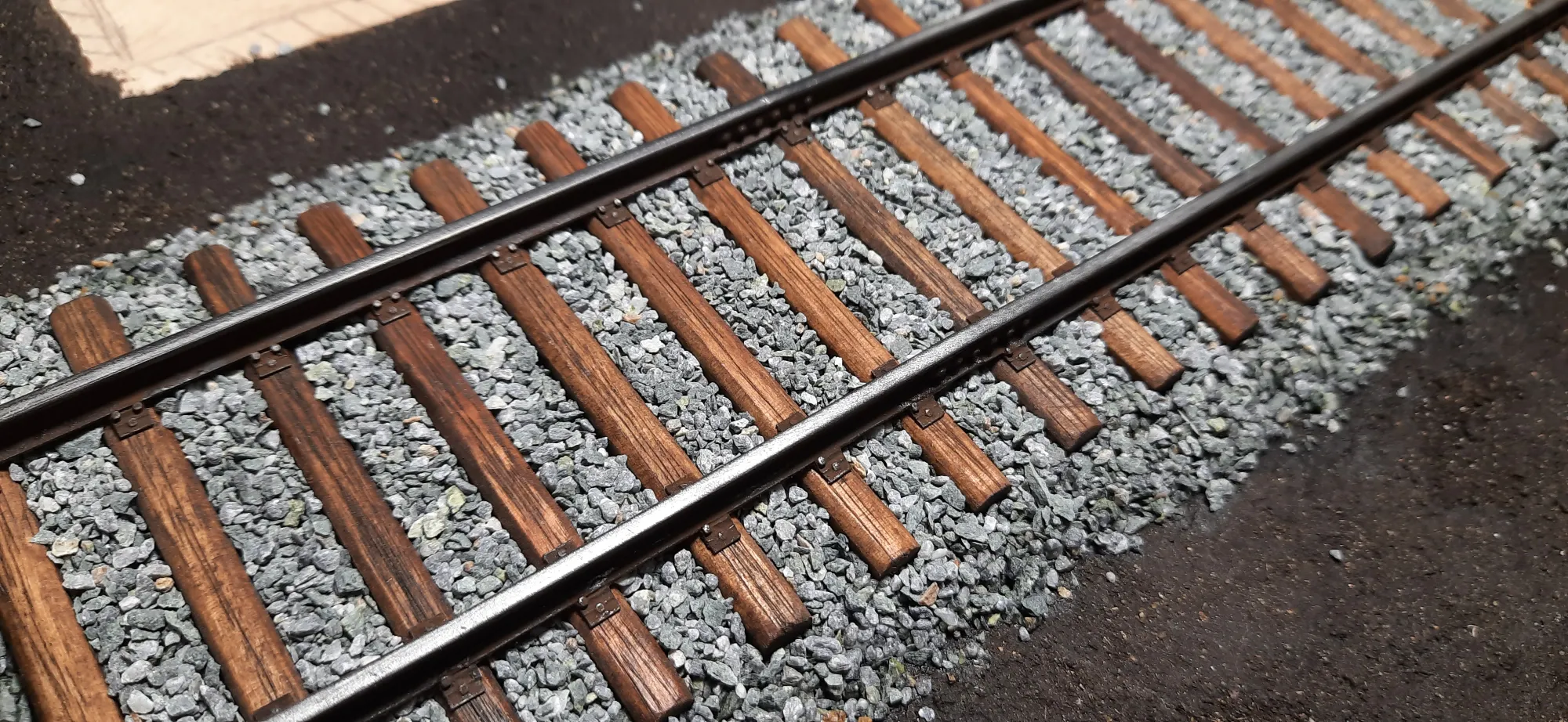 Далее красим из аэрографа рельсы в цвет тёмной стали, добавляем пигменты ржавчины, потёки мазута, небольшую наполированность металла. Железнодорожные пути готовы!