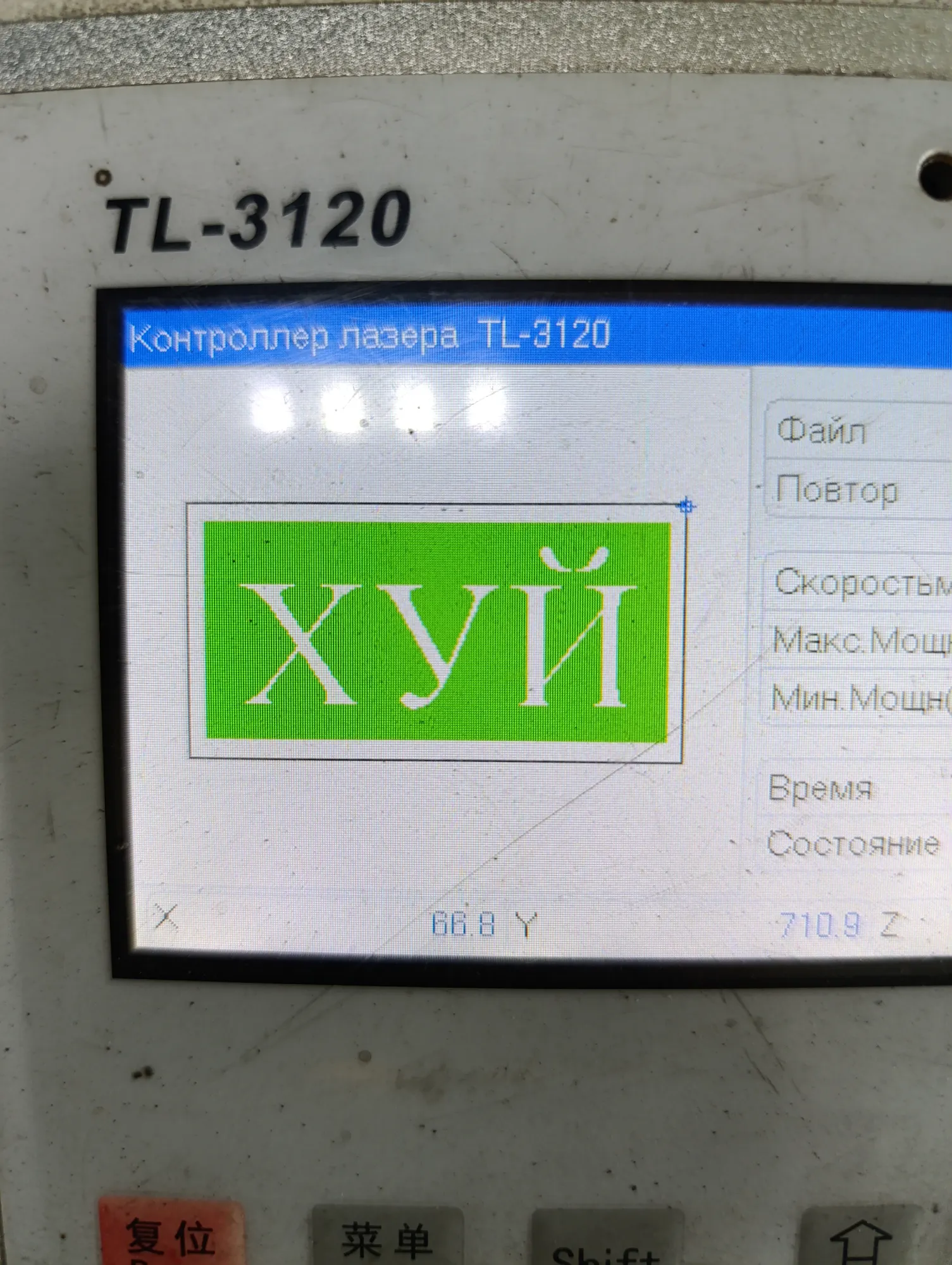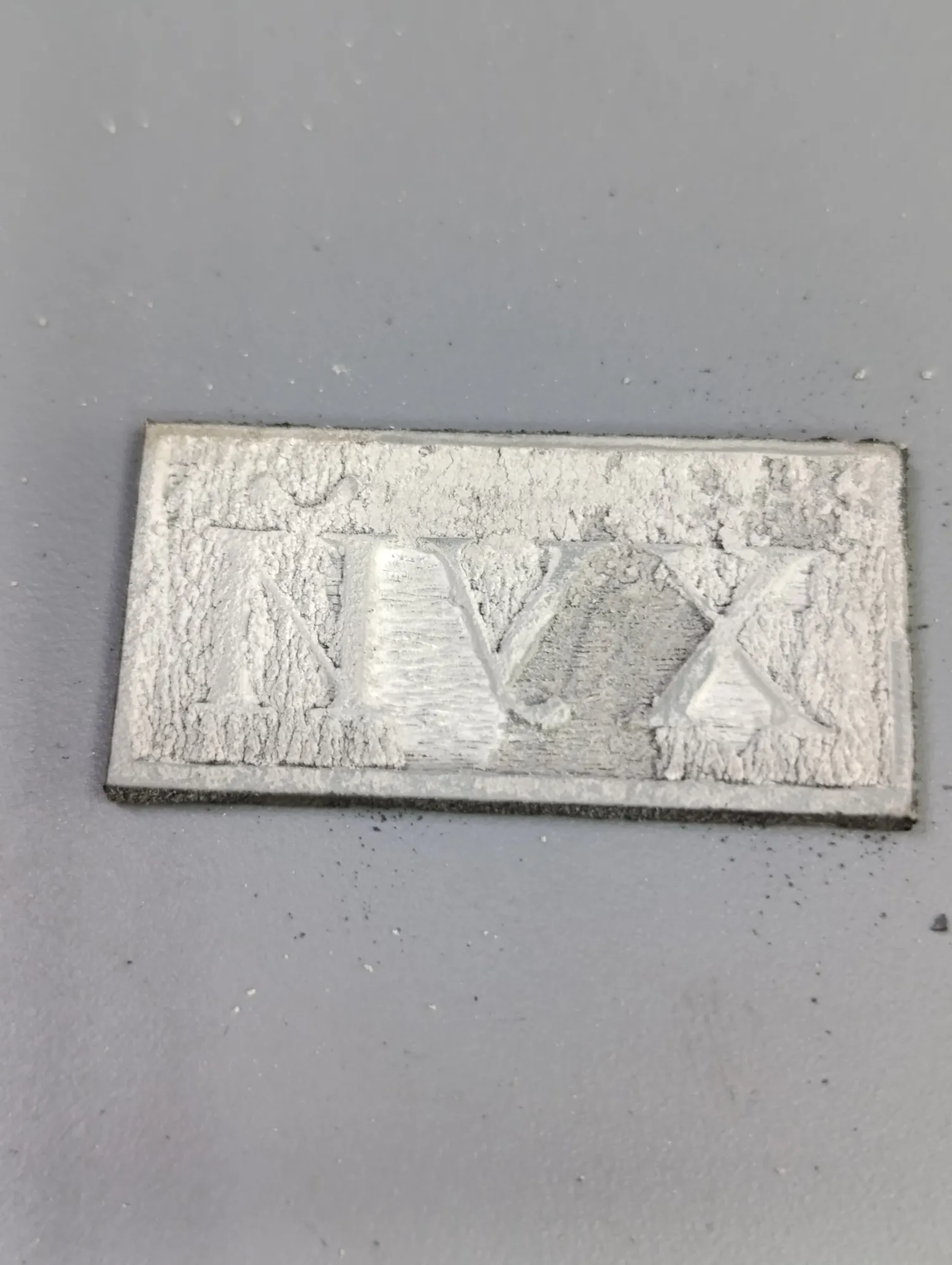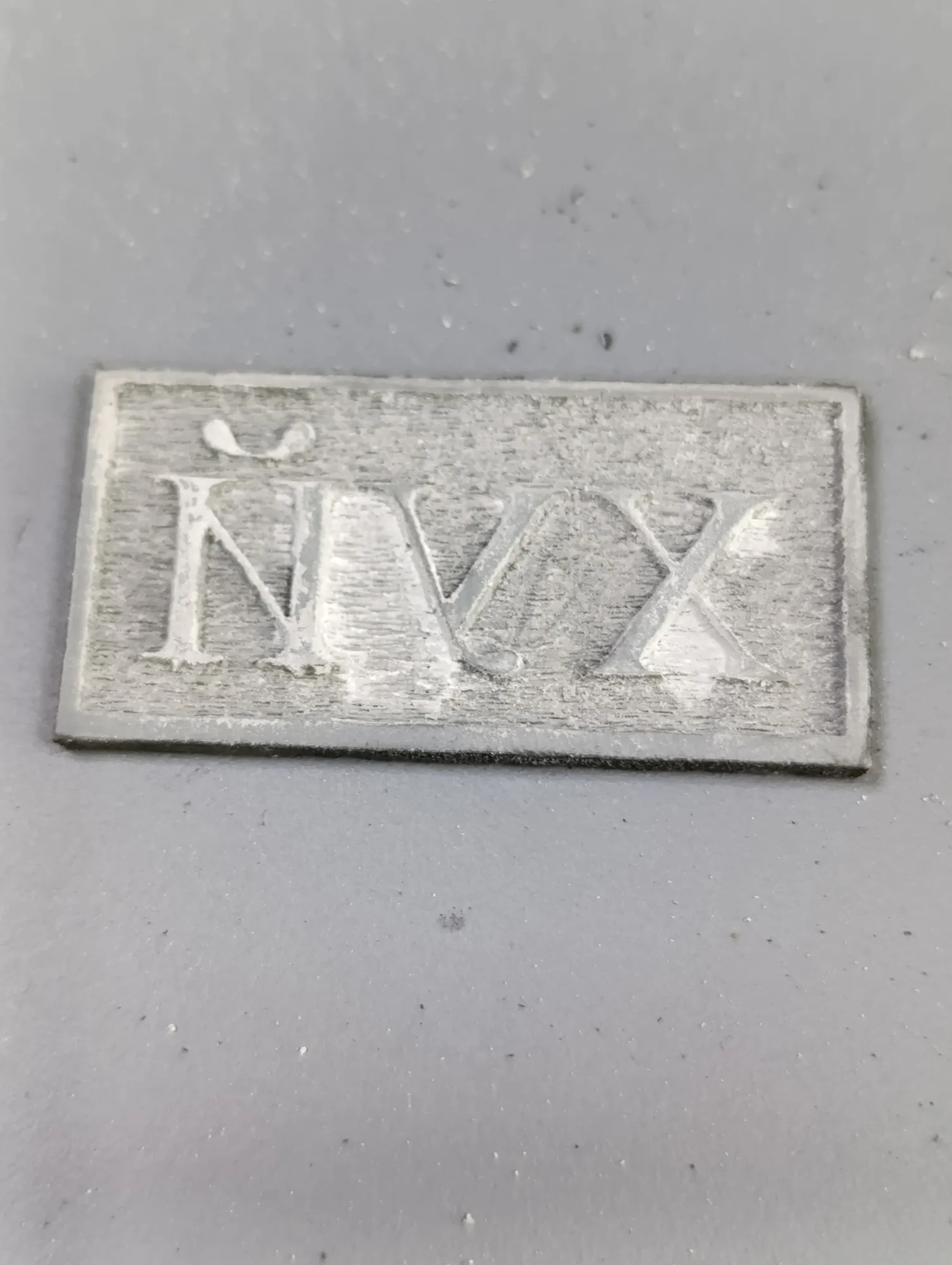 Вот он: новорождённый, горячий и слегонца запылённый. Вот эта белая штуковина, которая закрывает буквы - это продукты горения и остатки от сгоревшей резины, которую сжёг лазерный луч и оставил нам только хуй с рамочкой.