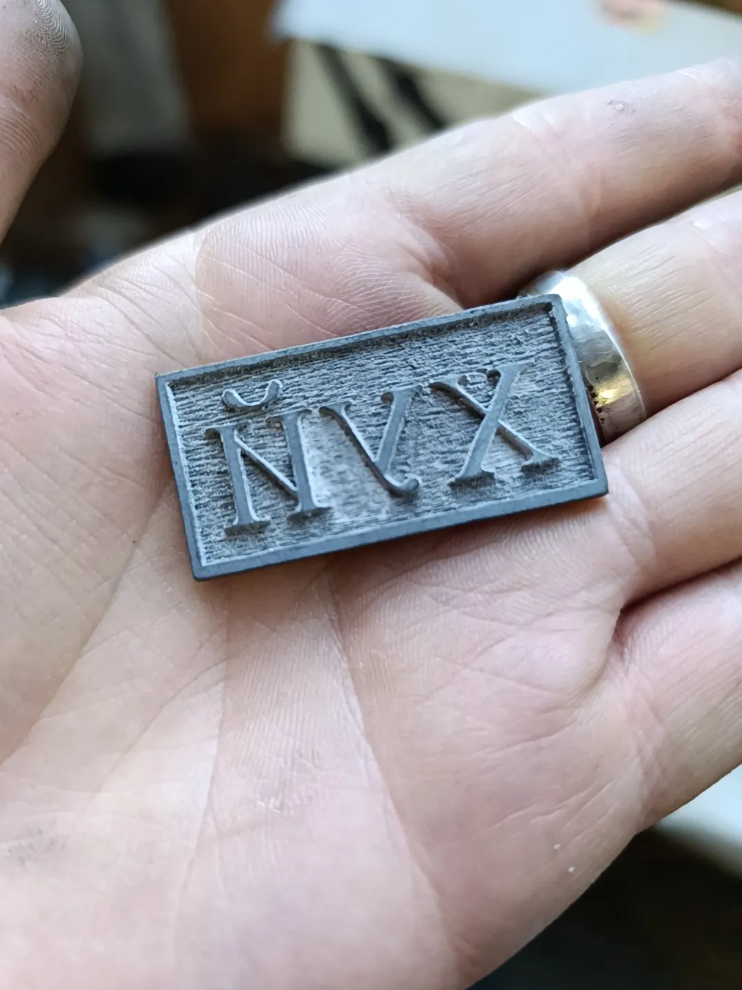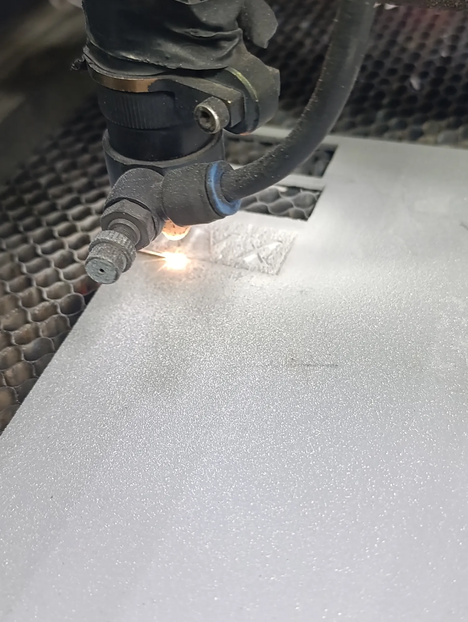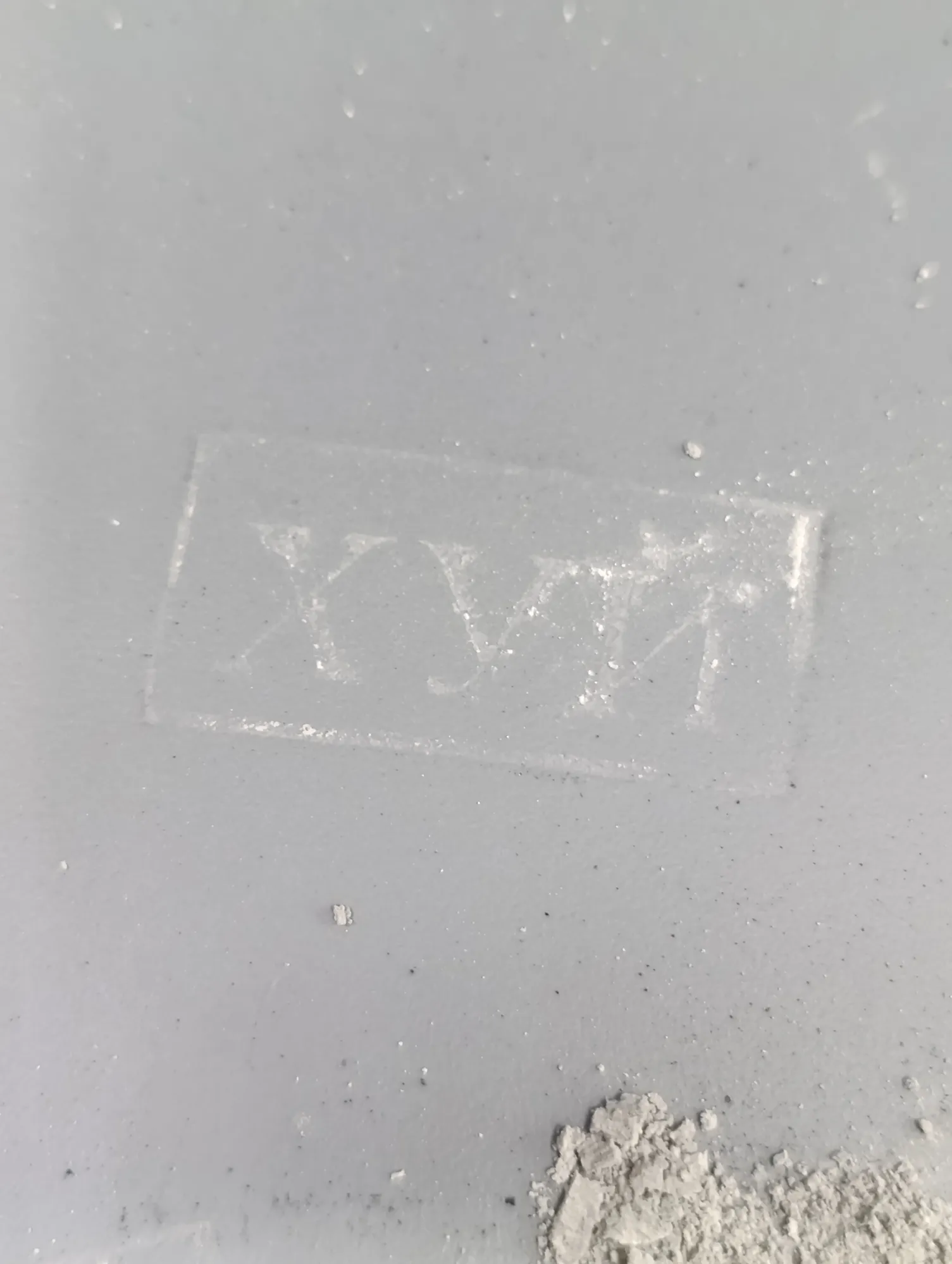 Вот он: новорождённый, горячий и слегонца запылённый. Вот эта белая штуковина, которая закрывает буквы - это продукты горения и остатки от сгоревшей резины, которую сжёг лазерный луч и оставил нам только хуй с рамочкой.