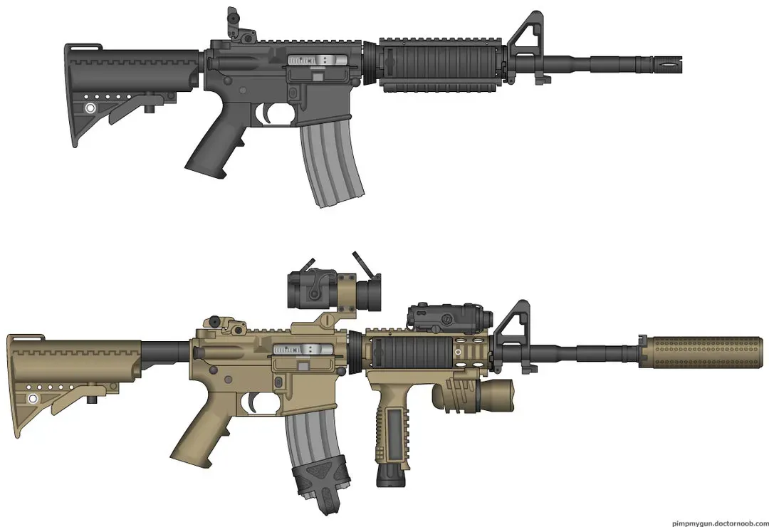 Стоковый М4А1 и в обвесе для сил специальных операций.