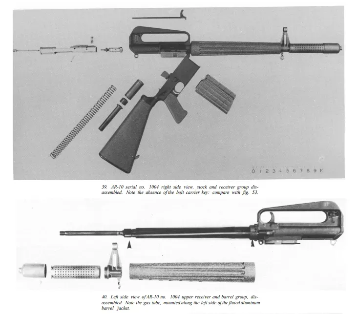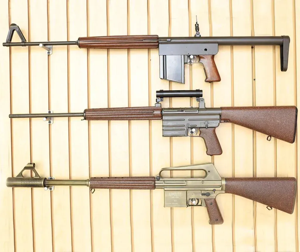 Три прототипа AR-10 под разные калибры. Первый - под британский калибр .30-06 c магазином от британской автоматический винтовки BAR и целиком, позаимствованным у Johnson. Вторая - под калибр .308 с телескопическим прицелом. Третья - так называемый AR-10A