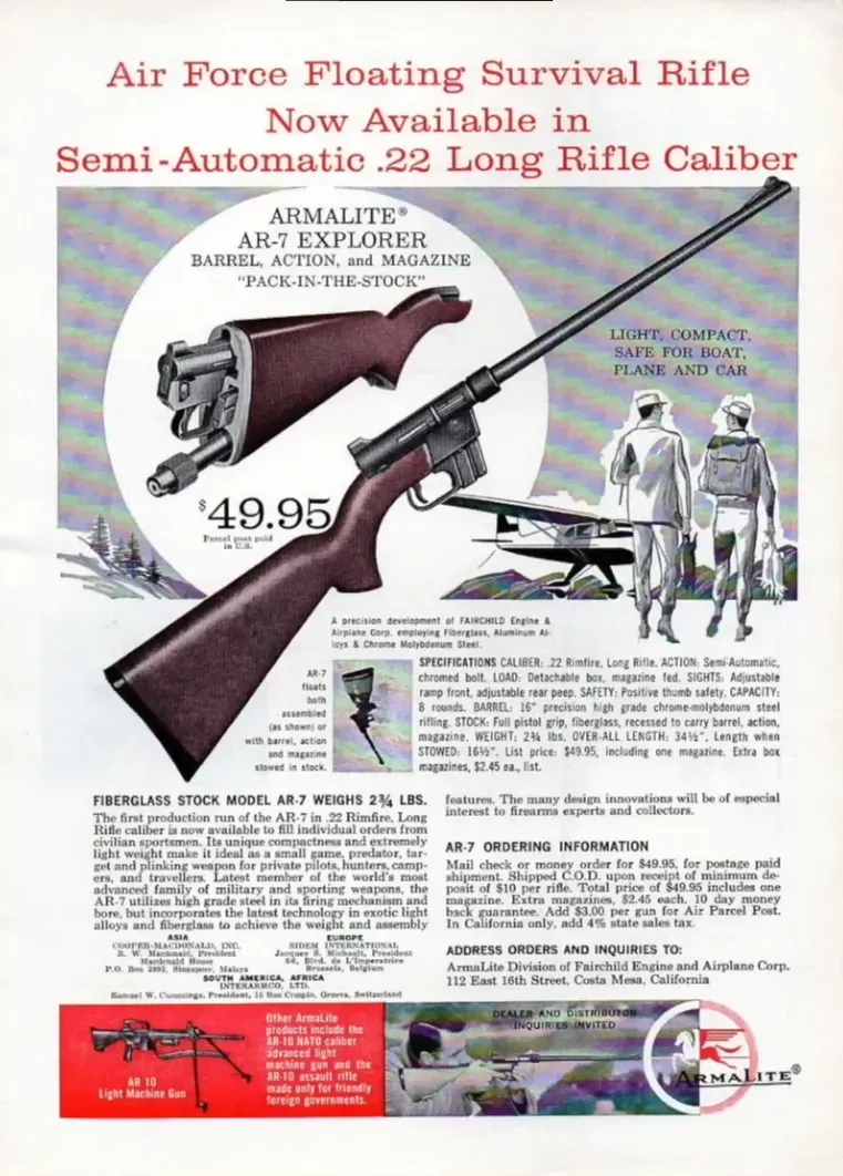Признав коммерческий потенциал концепции складной винтовки, ArmaLite поручила Стоунеру адаптировать конструкцию для гражданского рынка. Результатом стала AR-7 Explorer, представленная в 1959 году. Новая модель сохранила возможность разборки и хранения компонентов в прикладе от AR-5. Также на ней установили упрощённый свободный затвор и изменили калибр на .22 Long Rifle.