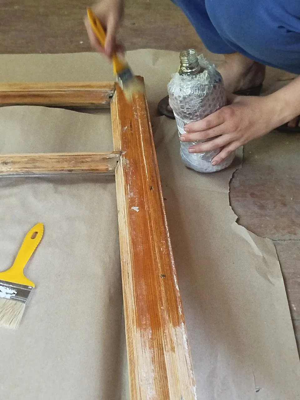 Краски на внешней стороне рам почти не осталось, поэтому там сразу начали шкурить и шлифовать, для чего даже была куплена шлифмашинка, а вот на внутренней сохранилось белая краска, которую надо было снимать. Для этого использовали смывку из ближайшего строймага