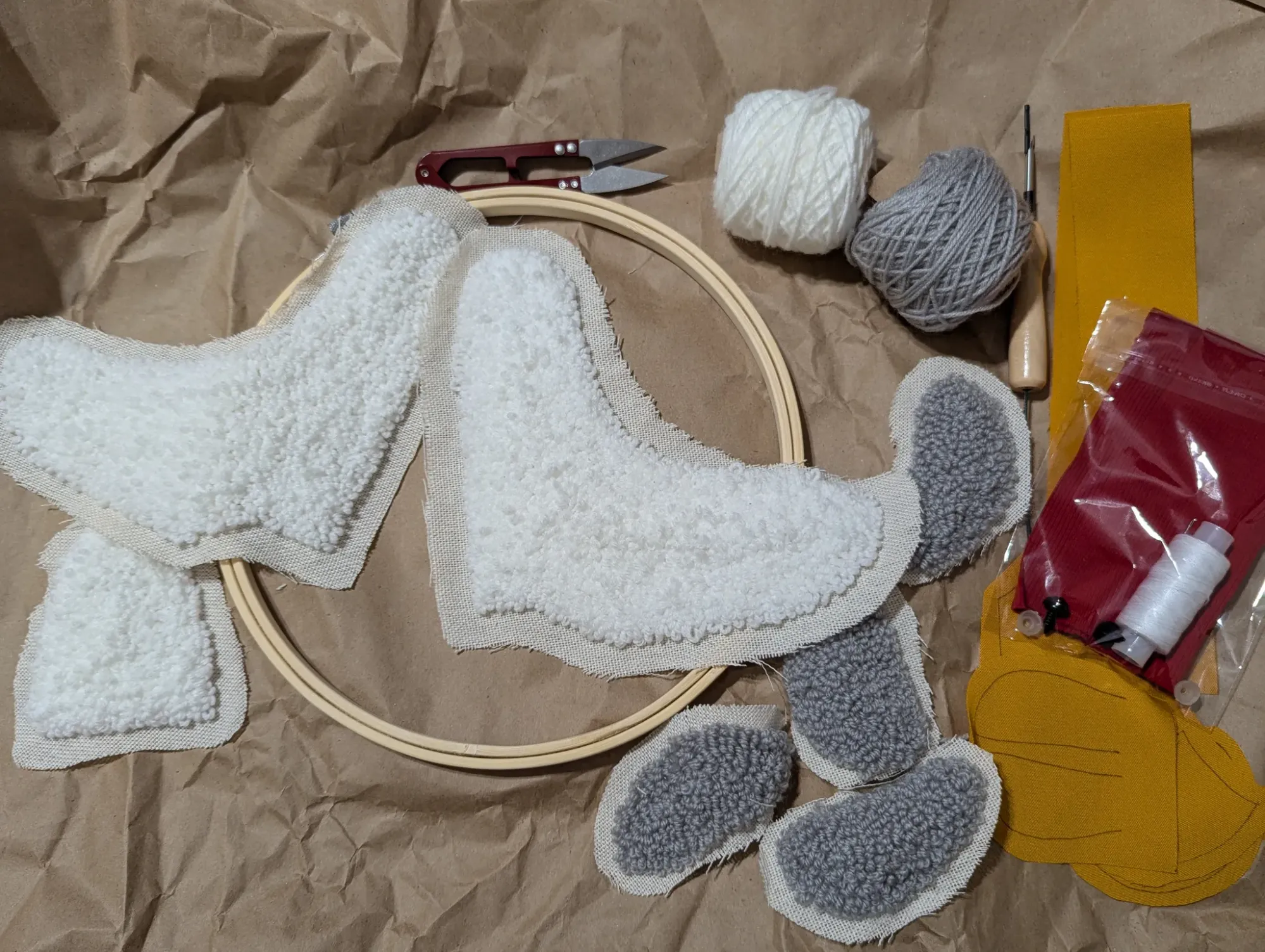 У меня уже был опыт вышивания в ковровой технике, однако это были простые полотна на подрамнике (как раз процесс работы над одним из них на видео выше). Но тут после вышивки пришлось ещё разрезать всё на детальки.