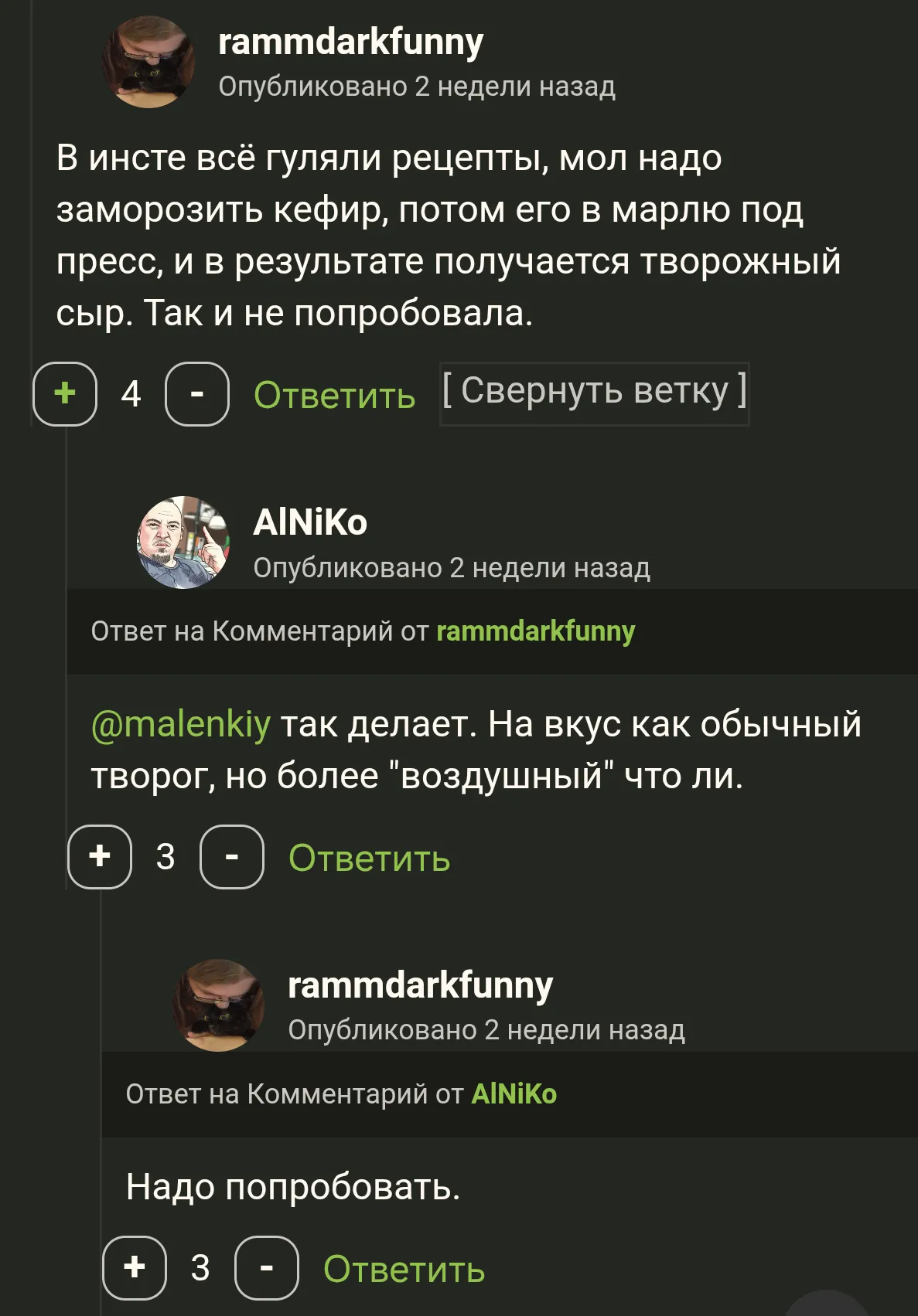 Дела семейные, увидела далеко не сразу, но в краце ответила в ветке, как делала из простокваши, что нам давали на молочной кухне. Там же пообещала @Kukabara повторить рецепт в посте, уже из кефира) тем более, что лафа с молочной кухней у нас уже закончилась🙈