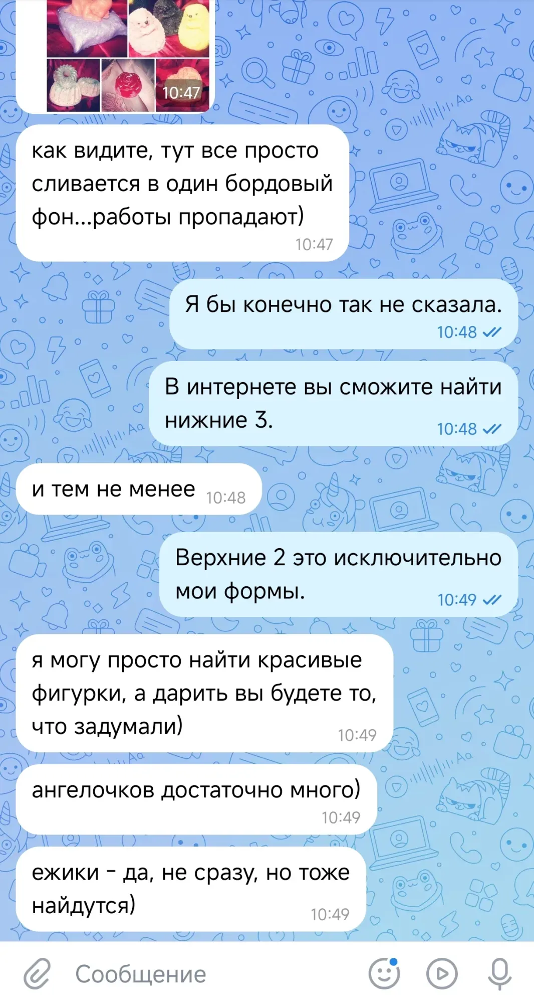 Нашла переписку, аж от сентября 2015 года, с организатором какого-то конкурса, где я выступила одним из "спонсоров". Где та усиленно браковала мои фото и предлагала вместо реально моих работ в качестве подарков, выставить фото чужих работ из интернета🙈. Видите ли в формат не вписываюсь🙈