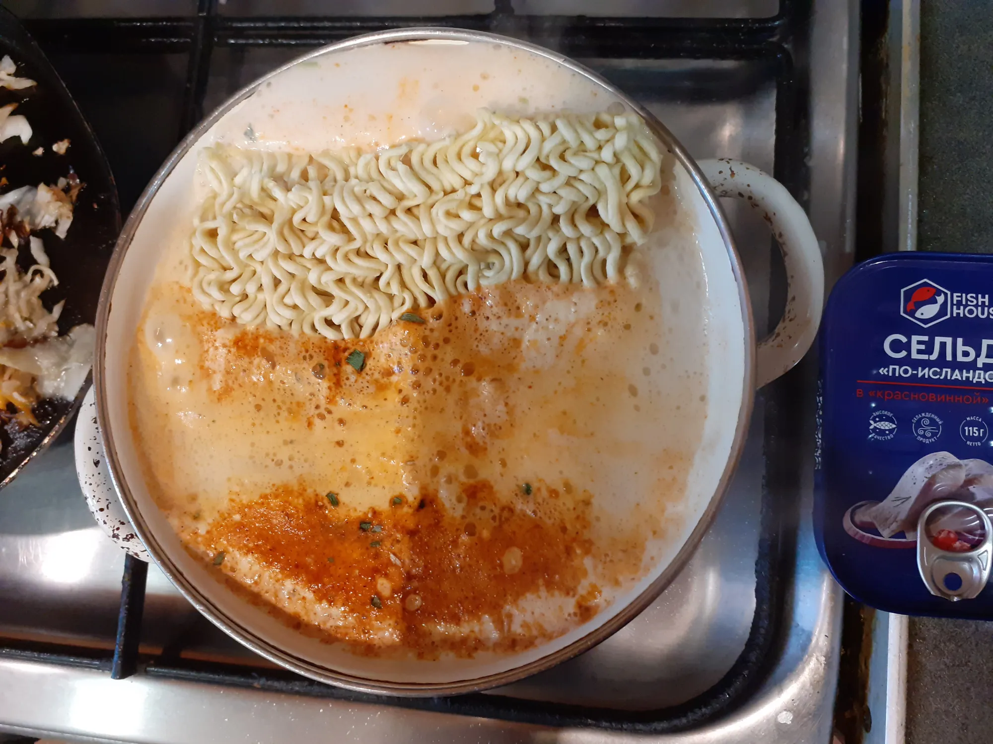 Кипятим молоко с водой 1:1 по рецепту Чан рамена в общем количестве 2.5 стакана, добавляем специи.