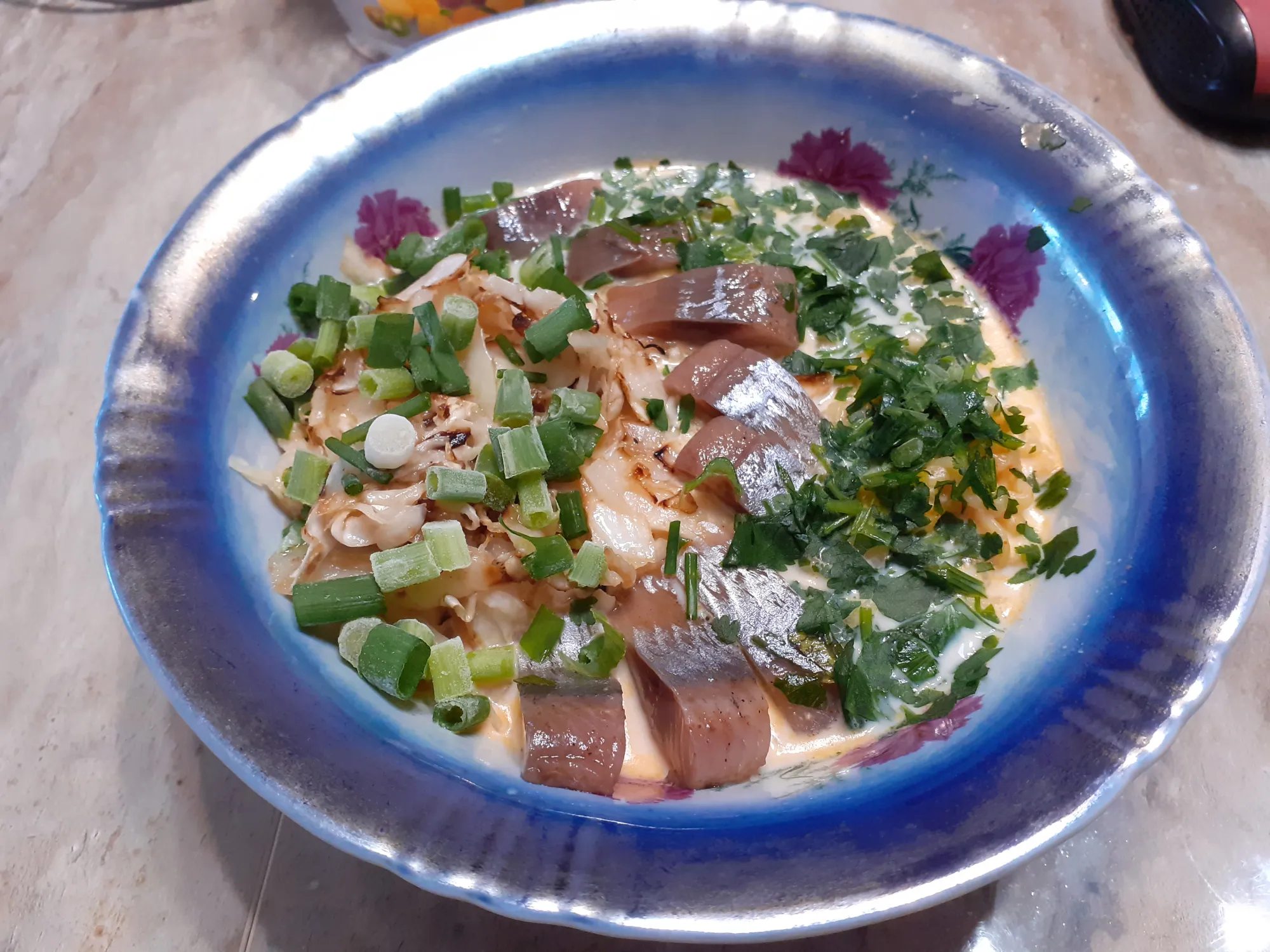 сервируем Боевое угощенье жареной капустой и селедкой. Поскольку блюдо явно околоазиатское, добавляем рубленного зеленого лука и кинзы