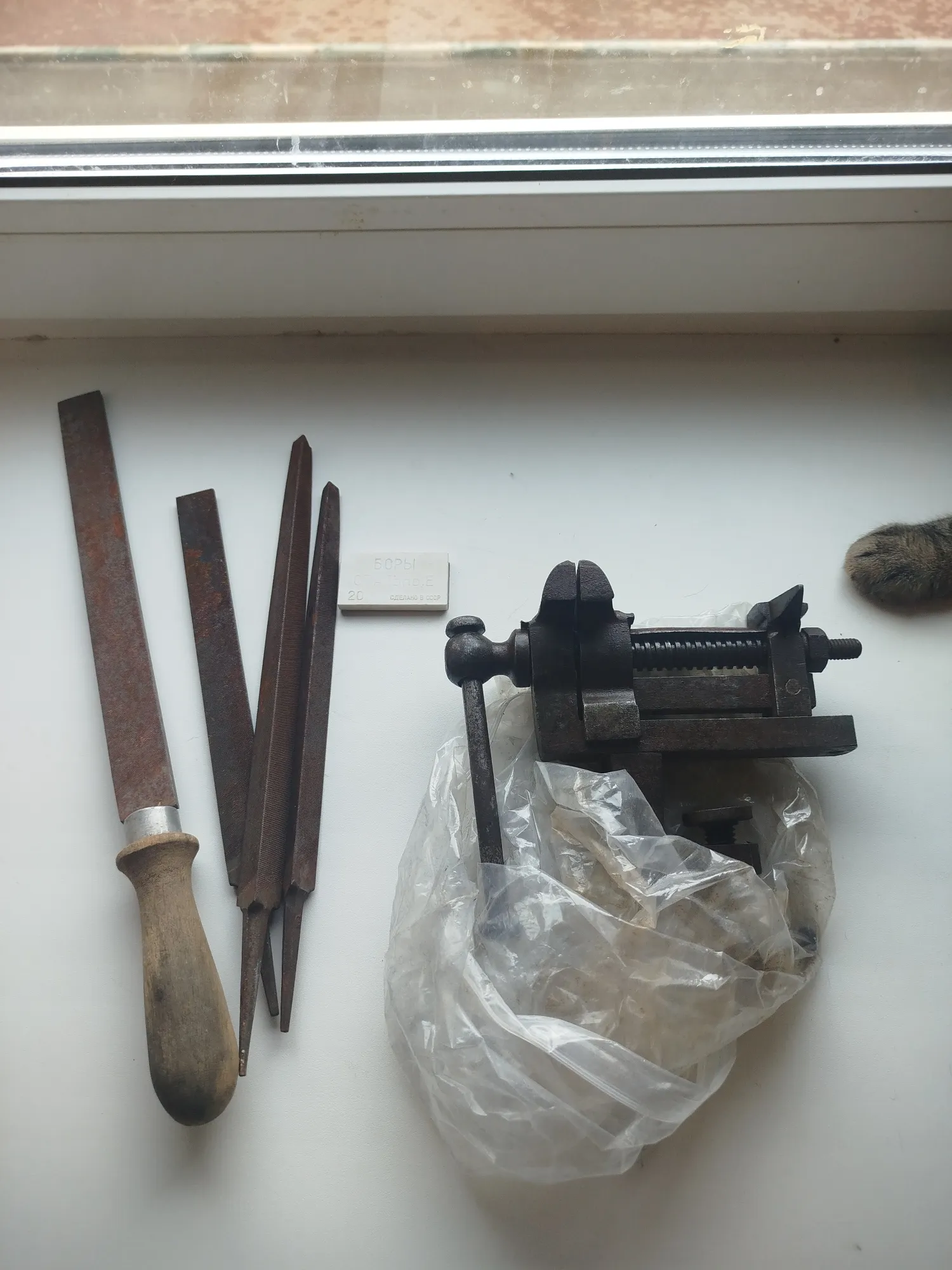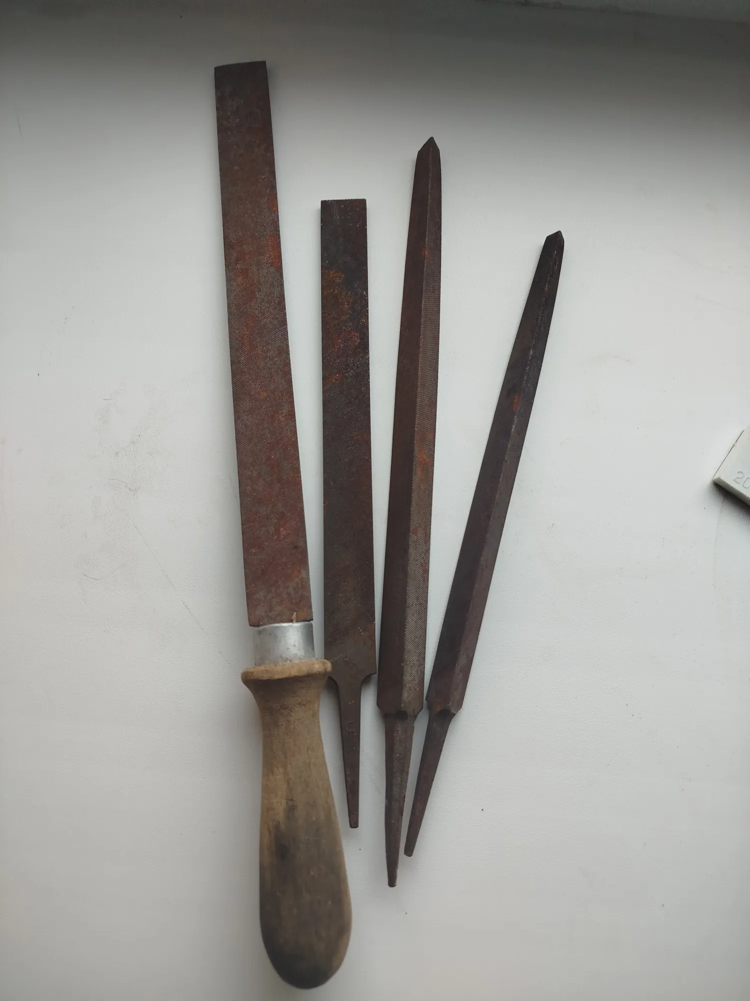 Напильники. Злые. Органолептический метод подсказал, что насечки живые- просто заржавели. Долго ковырялась в коробке и выбрала вот этот с деревянной ручкой.