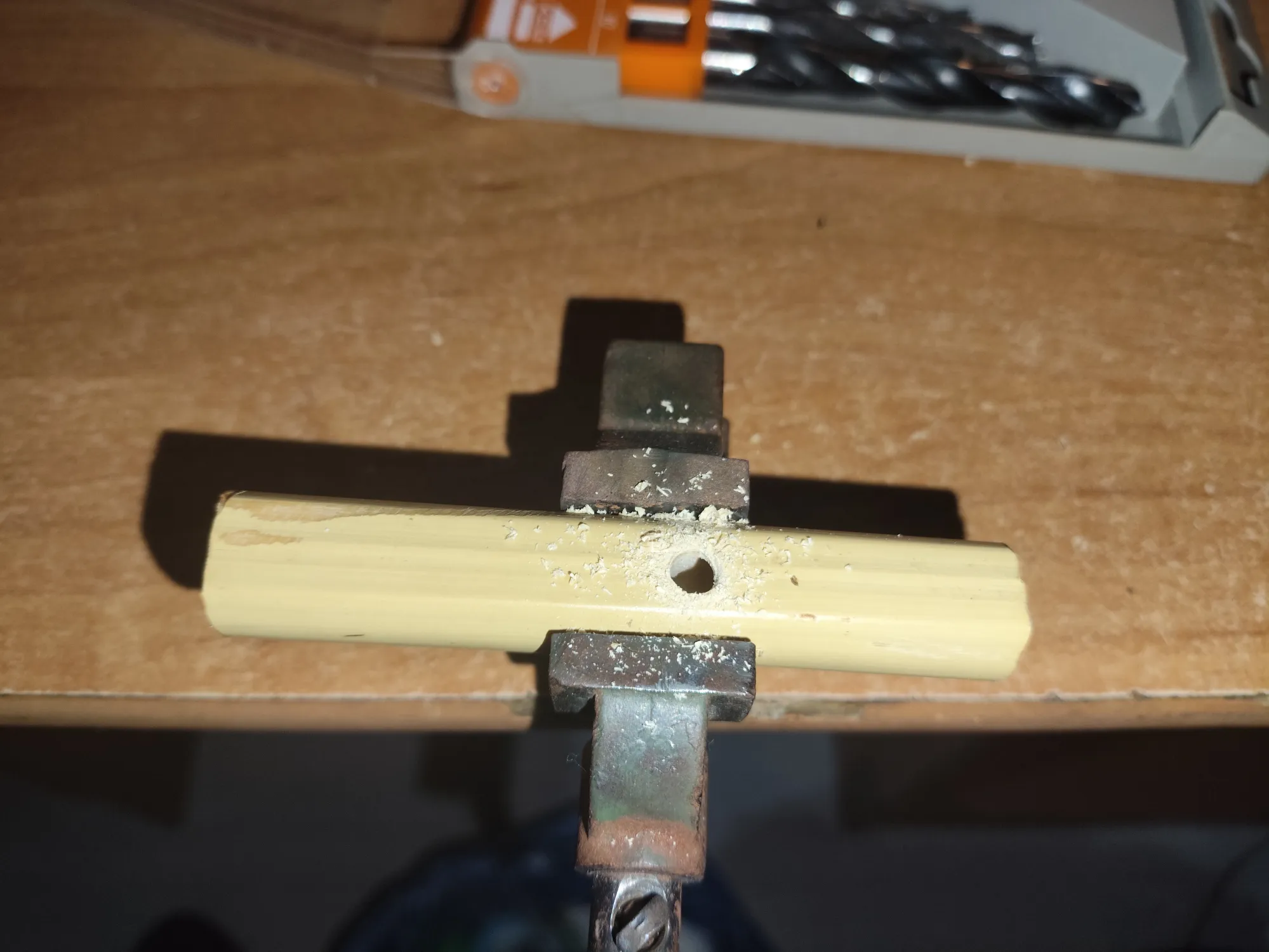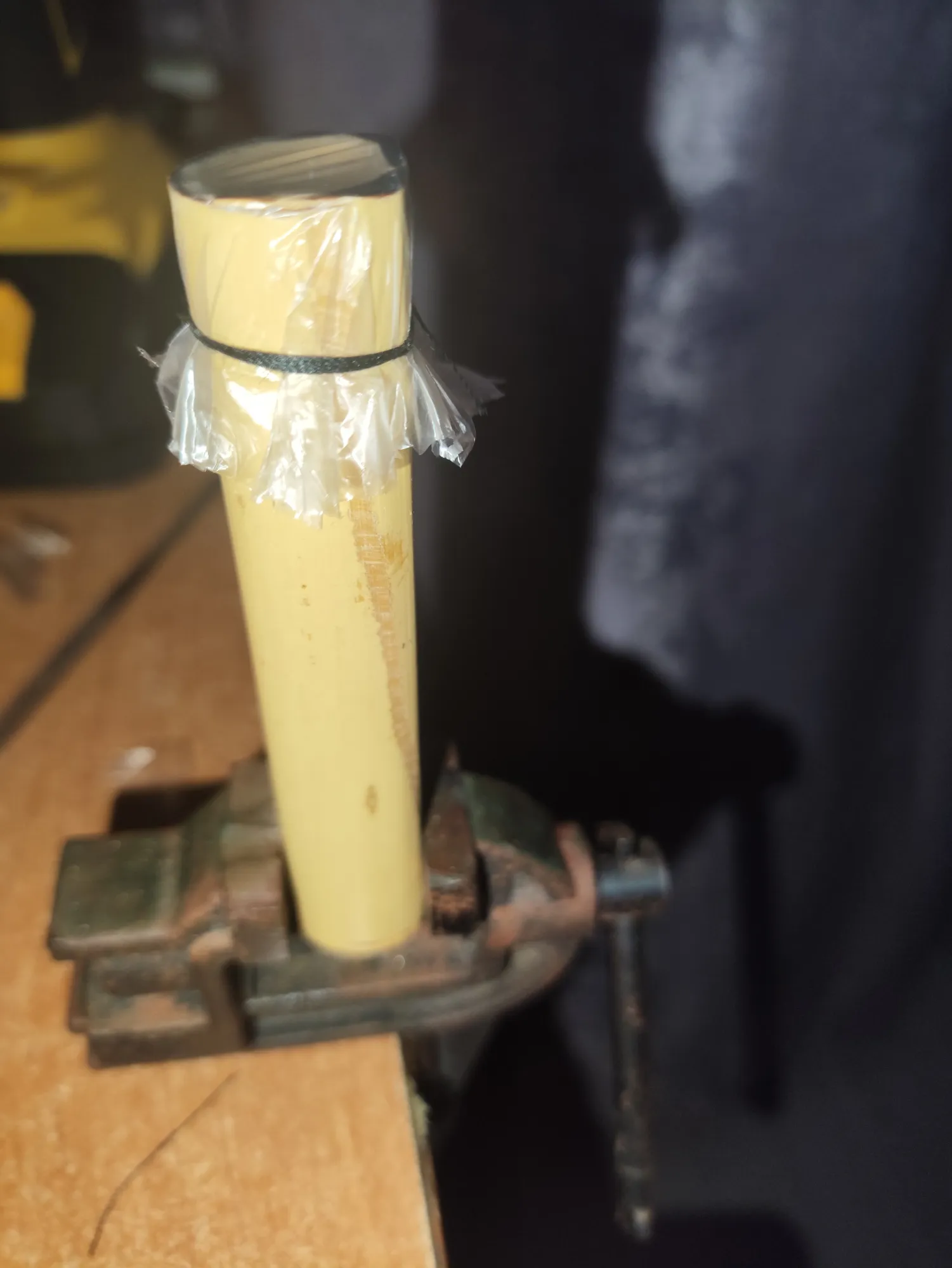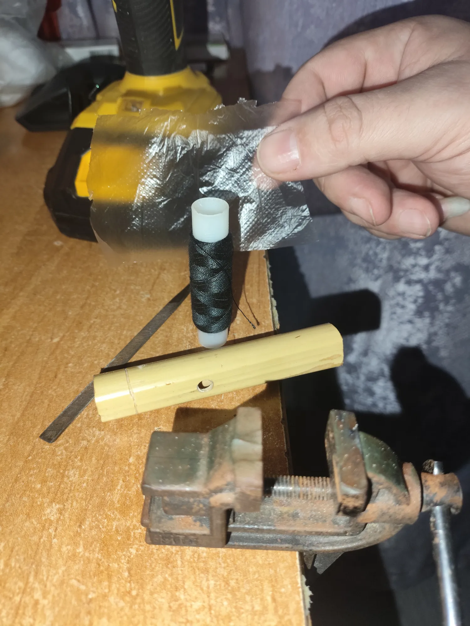 Отпиливаю кусок трубки. Раньше я эту штуку делал из втулки от кассовой ленты, поэтому, если вдруг у вас не завалялись кусок бамбука и бормашинка, то вот вам лайфхак — берите втулку от кассовой ленты.