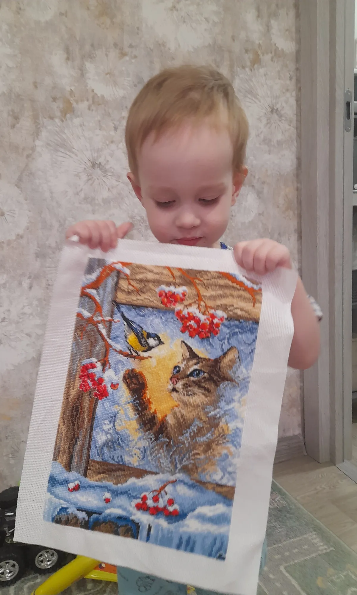 Ворвемся с новой законченной работой, которая была подарена мужем на день рождения. Как раз зимняя работа, все как надо, зима за окном. Ну и как положено, её вам покажет сын