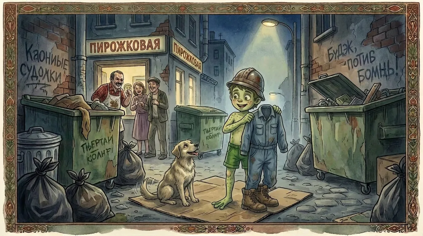 — А чего это ты, зелёный, по городу шляешься? Квакать разучился? Или денег нет? Эй, лягух, у тебя, поди, лапы короткие — до прилавка не дотянешься. Давай я схожу, а ты давай купюры.