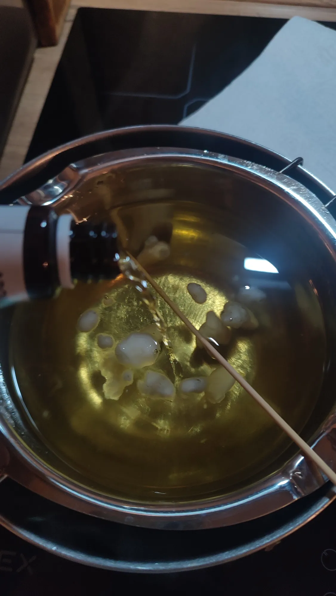 Когда воск почти расплавился добавляем отдушку и перемешиваем, последние комочки растворятся и можно заливать