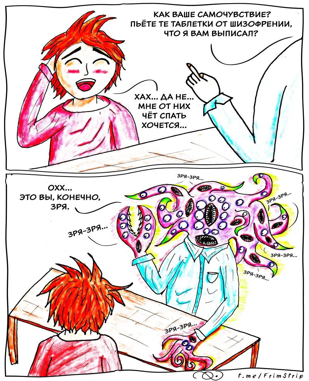 FrimStrip Опубликовано 2 недели назад [моё] [Сокровищница] Юмор Комиксы Шизофрения Зря-зря. Читать дальше...