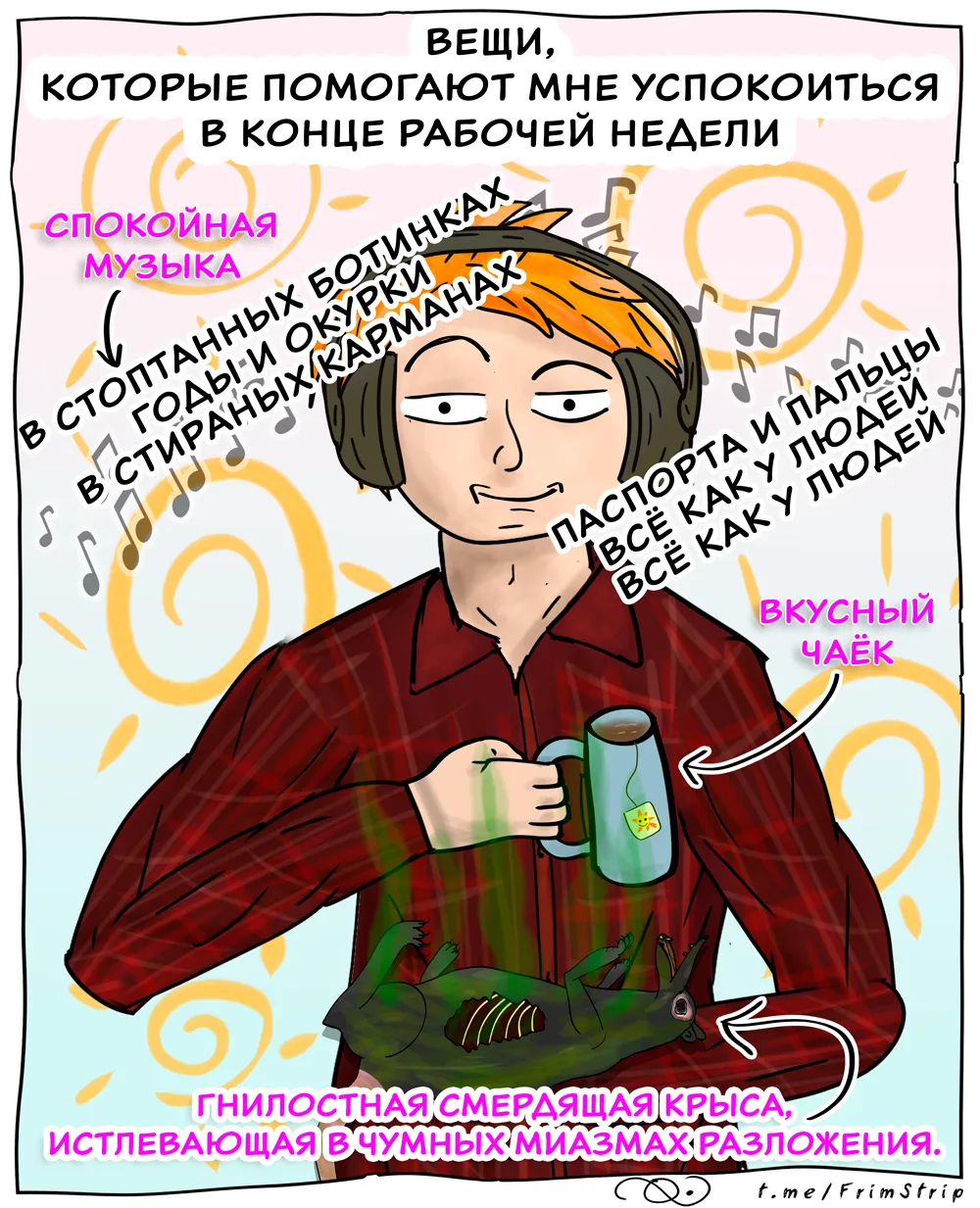FrimStrip Опубликовано 4 недели назад [моё] Юмор Комиксы Спокойствие "Счастливая жизнь начинается со спокойствия ума." - Марк Туллий Цицерон Читать дальше...