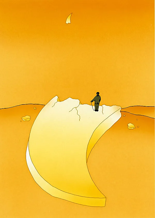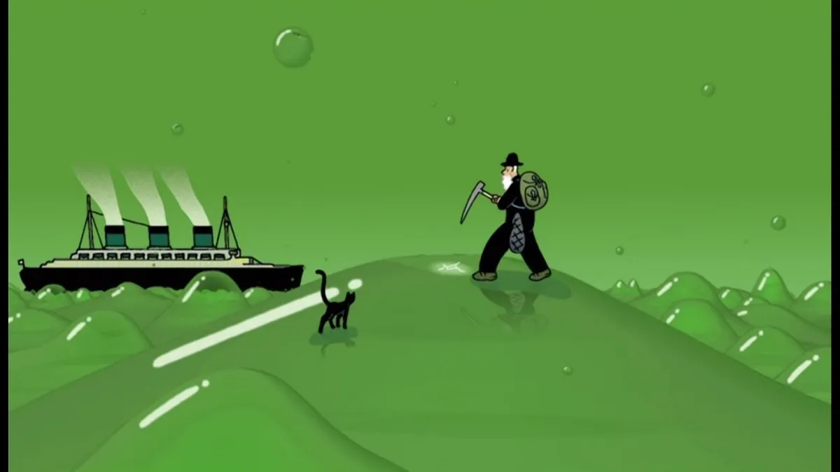 Посреди океана, сделанного из стекла, происходит интереснейшее событие: прыжок кита. Он движется так медленно, что от выныривания до погружения проходит много часов. Конечно же, всем очень хочется на это посмотреть, поэтому люди собираются вокруг, общаются друг с другом, а художник даже решает зарисовать зависшего в воздухе кита.