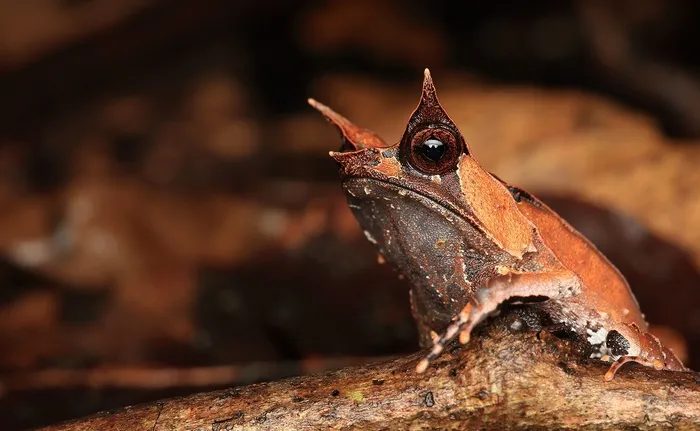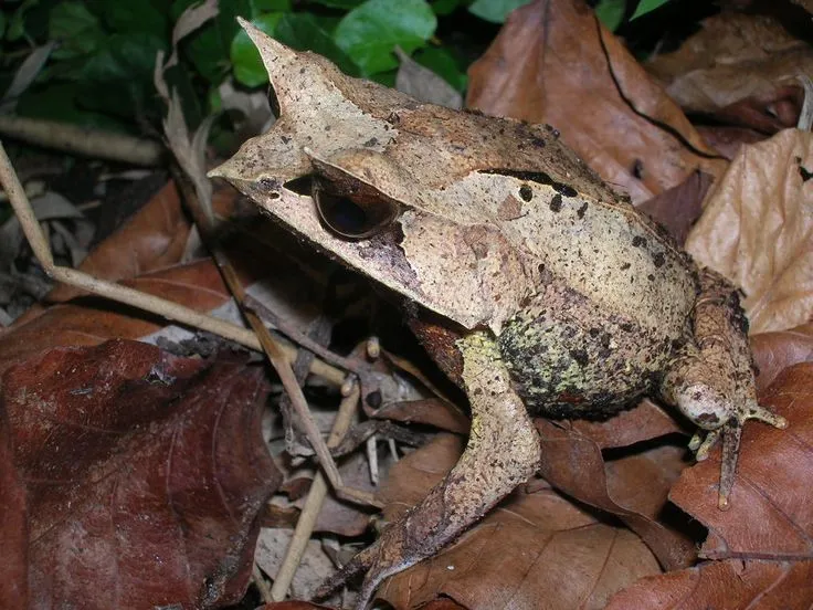 Рогатая лягушка относится к семейству чесночниц. Название она получила из-за кожных наростов над глазами, похожих на рога.