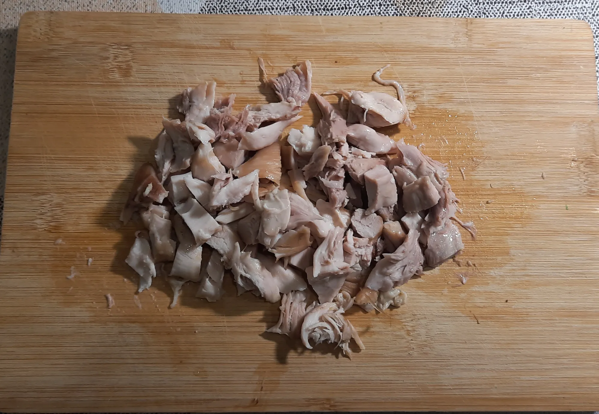 Так, что-то я отвлёкся. А вот номальный кусок курятины снимаем с косточки и режем на кусочки или рвём руками.