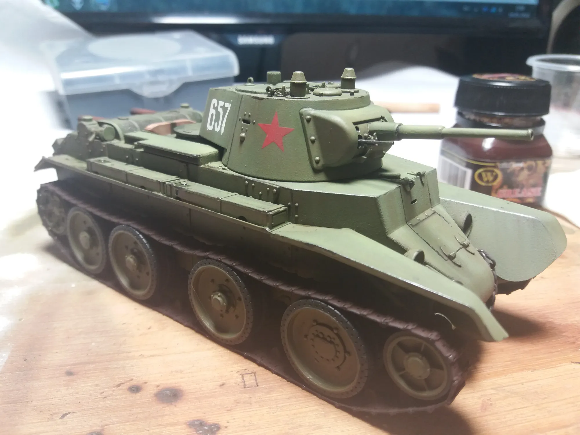 Окраска из аэрографа. Сначала грунтовка, затем акрил цвета а-ля 4БО (советская краска для бронетехники). Мелкие детали окрашены кистью. Так же использованы масляные краски, эмаль, пастель, сухие пигменты, графит, настоящая ржавчина и сухая дорожная грязь.