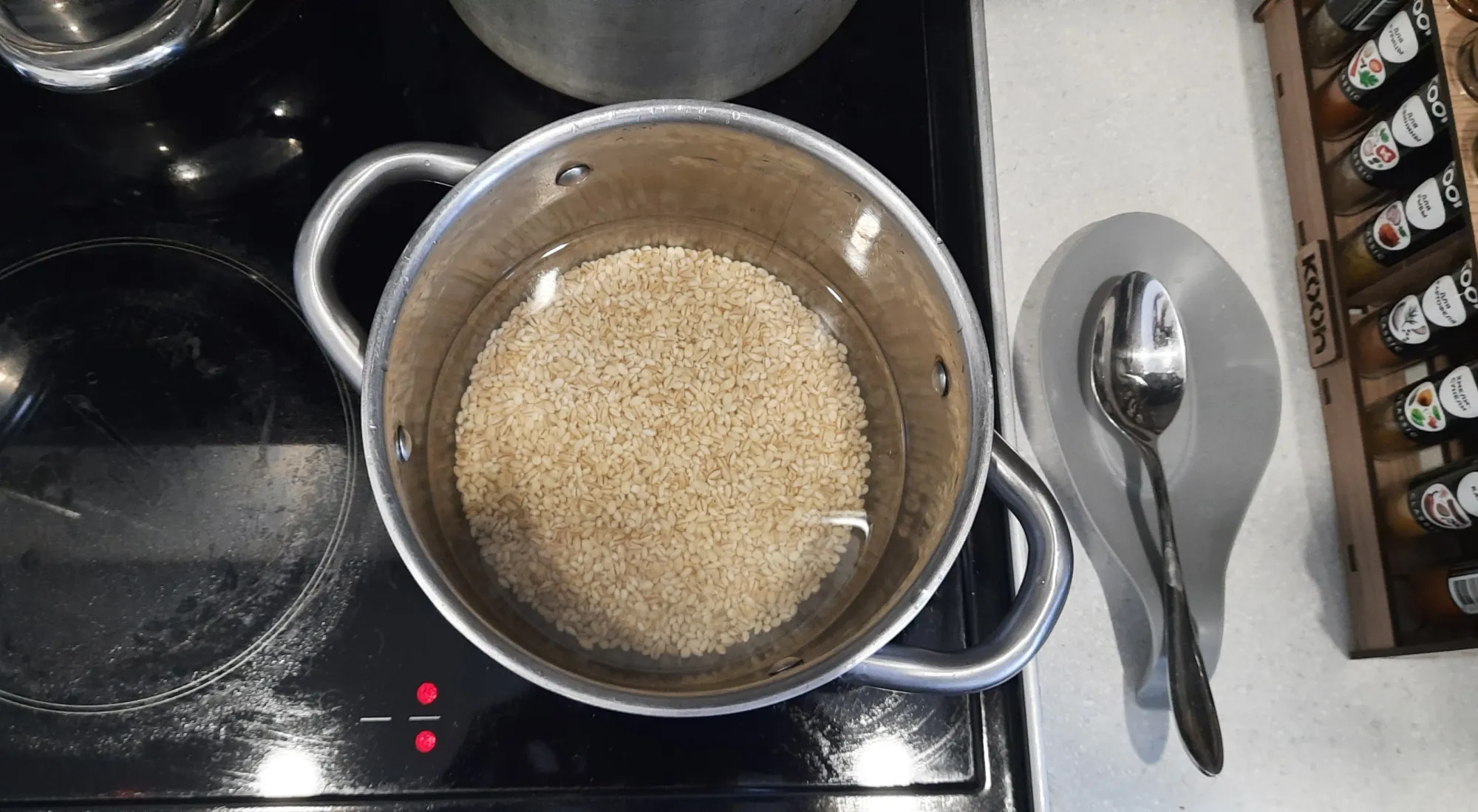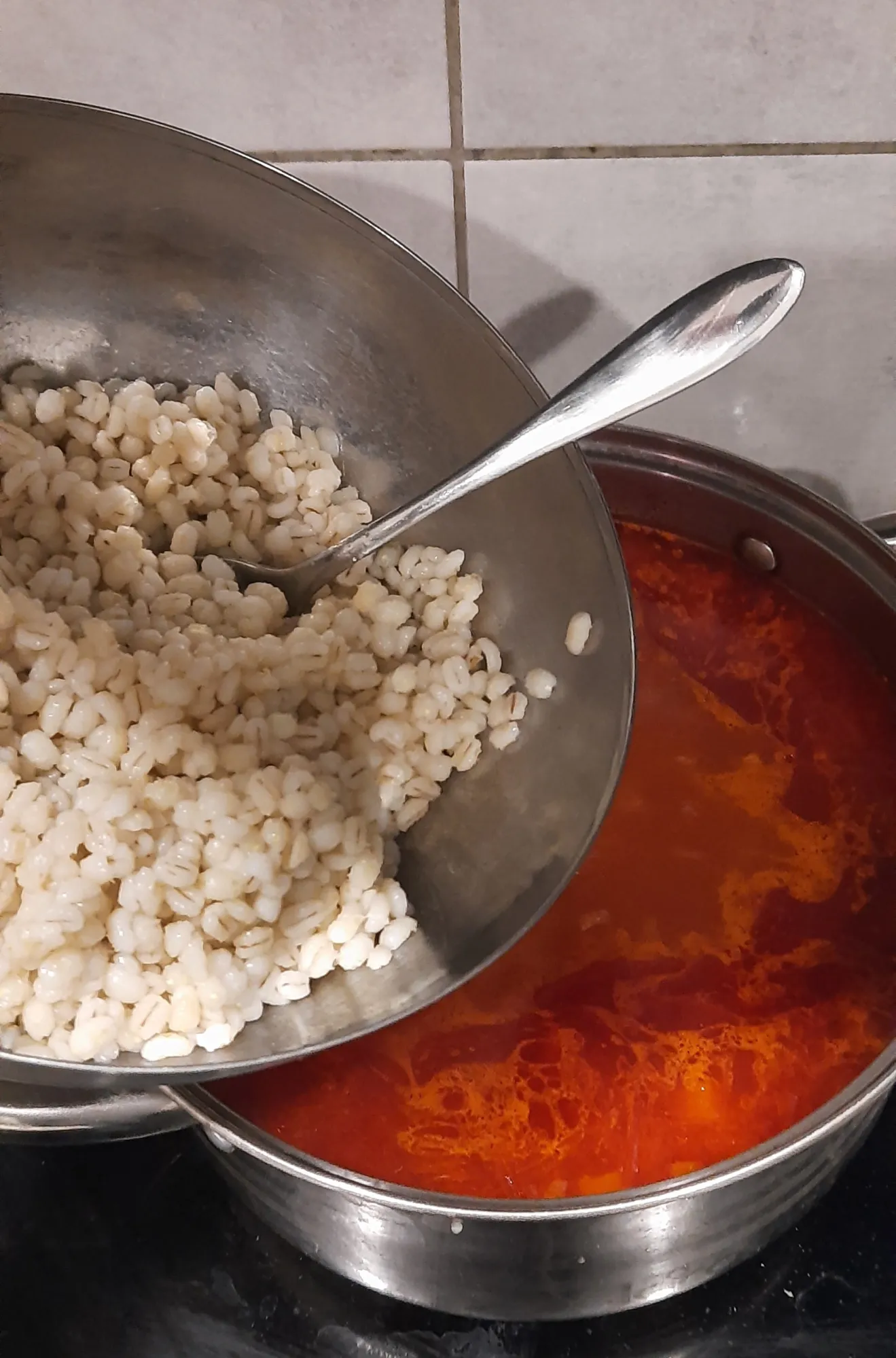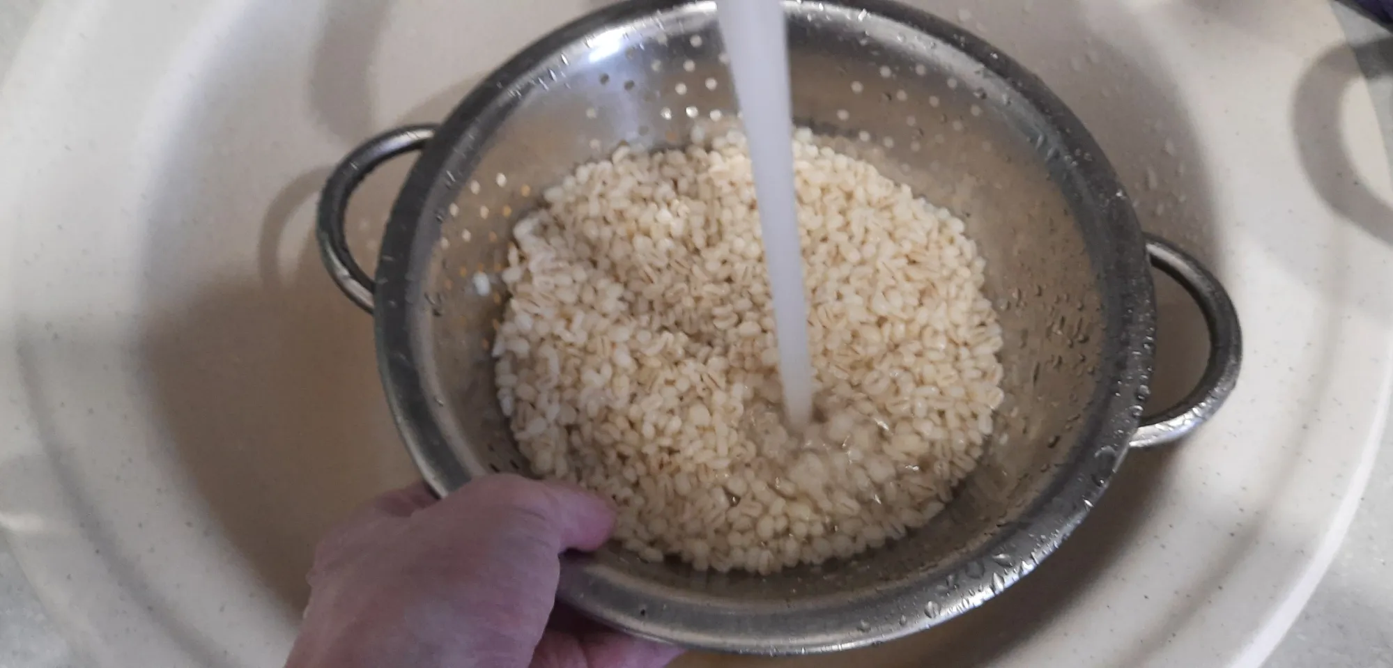 Когда перловка готова - промываем её прямо под краном через дуршлаг, и убираем в сторонку.
