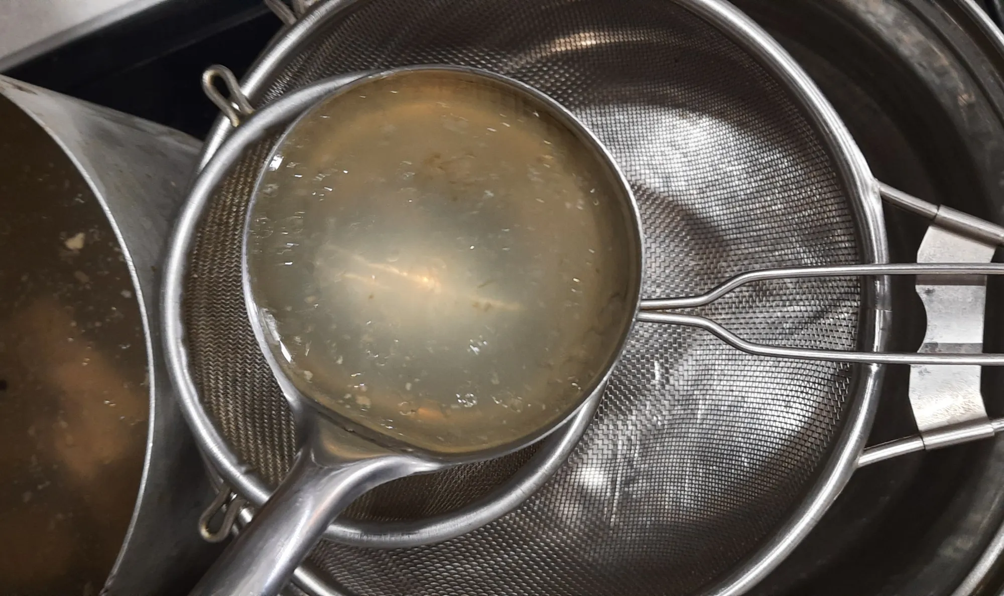 Тем временем сварился бульон. Процеживаем его.