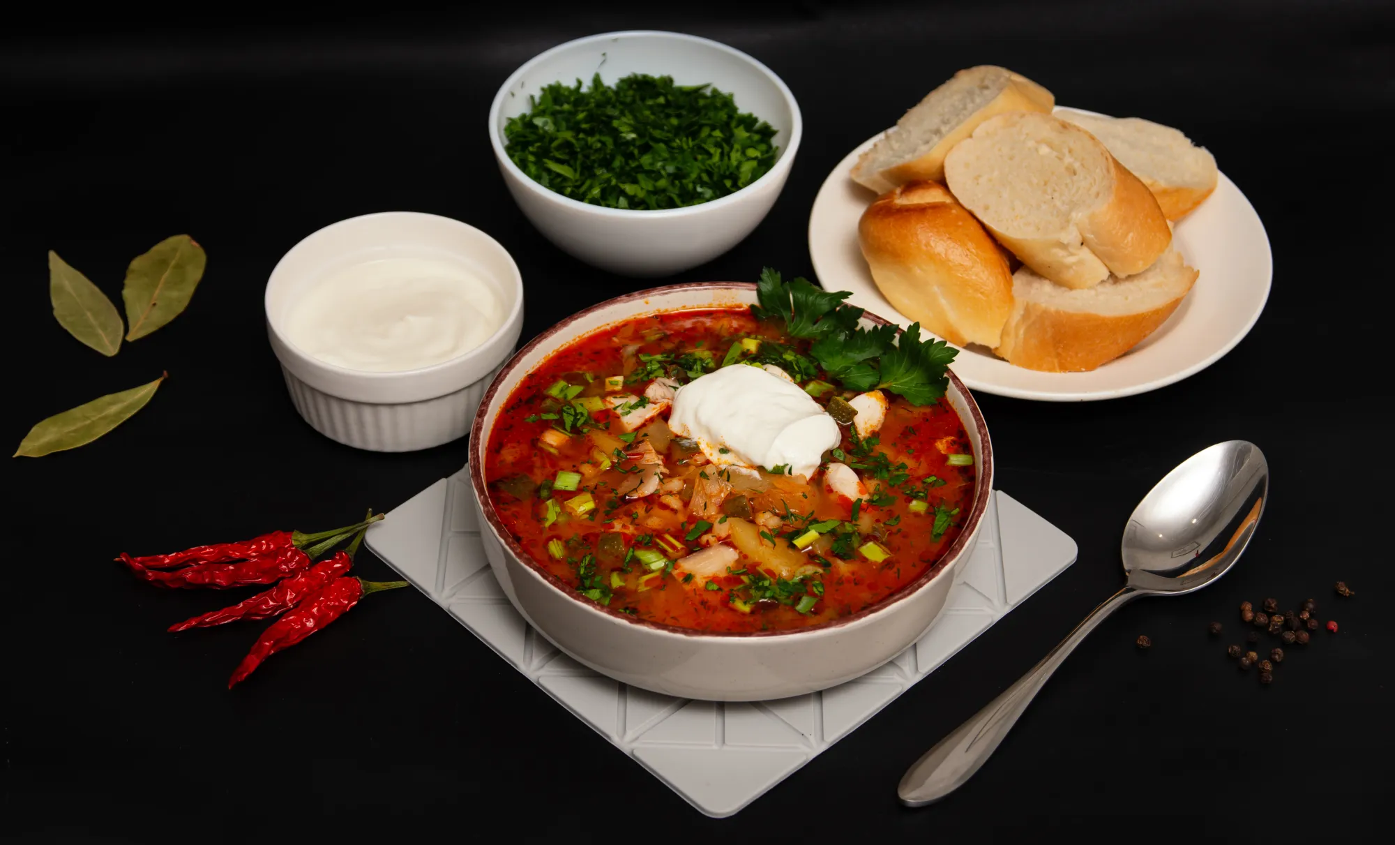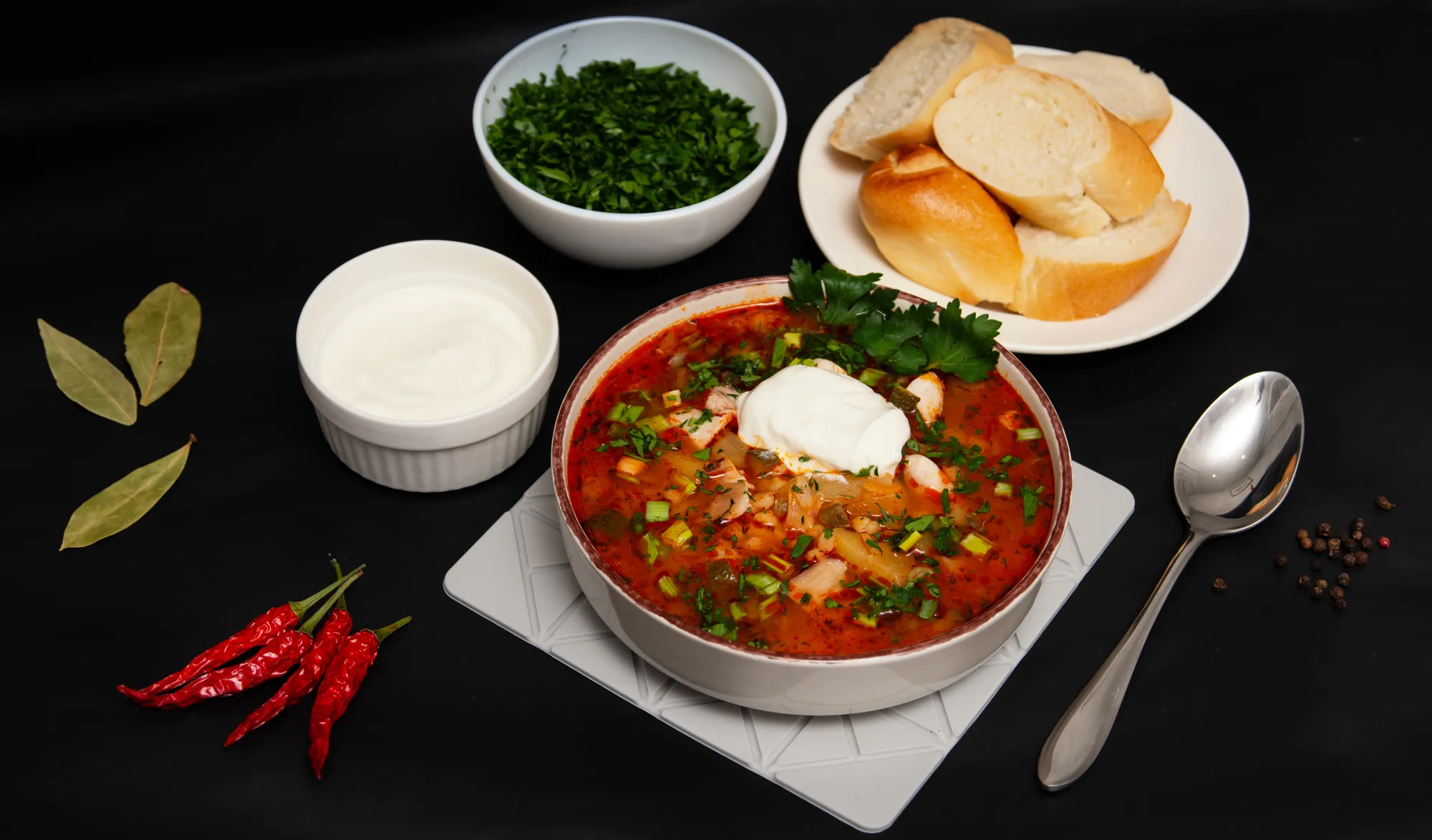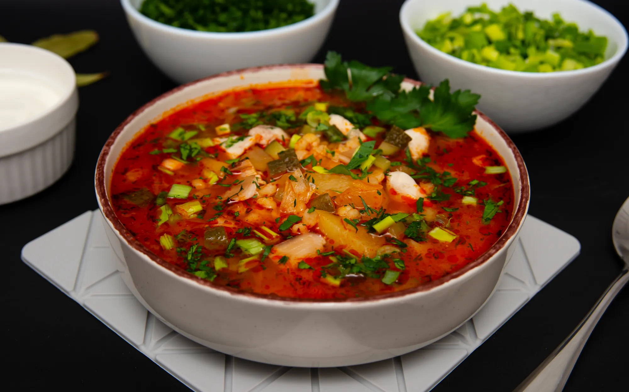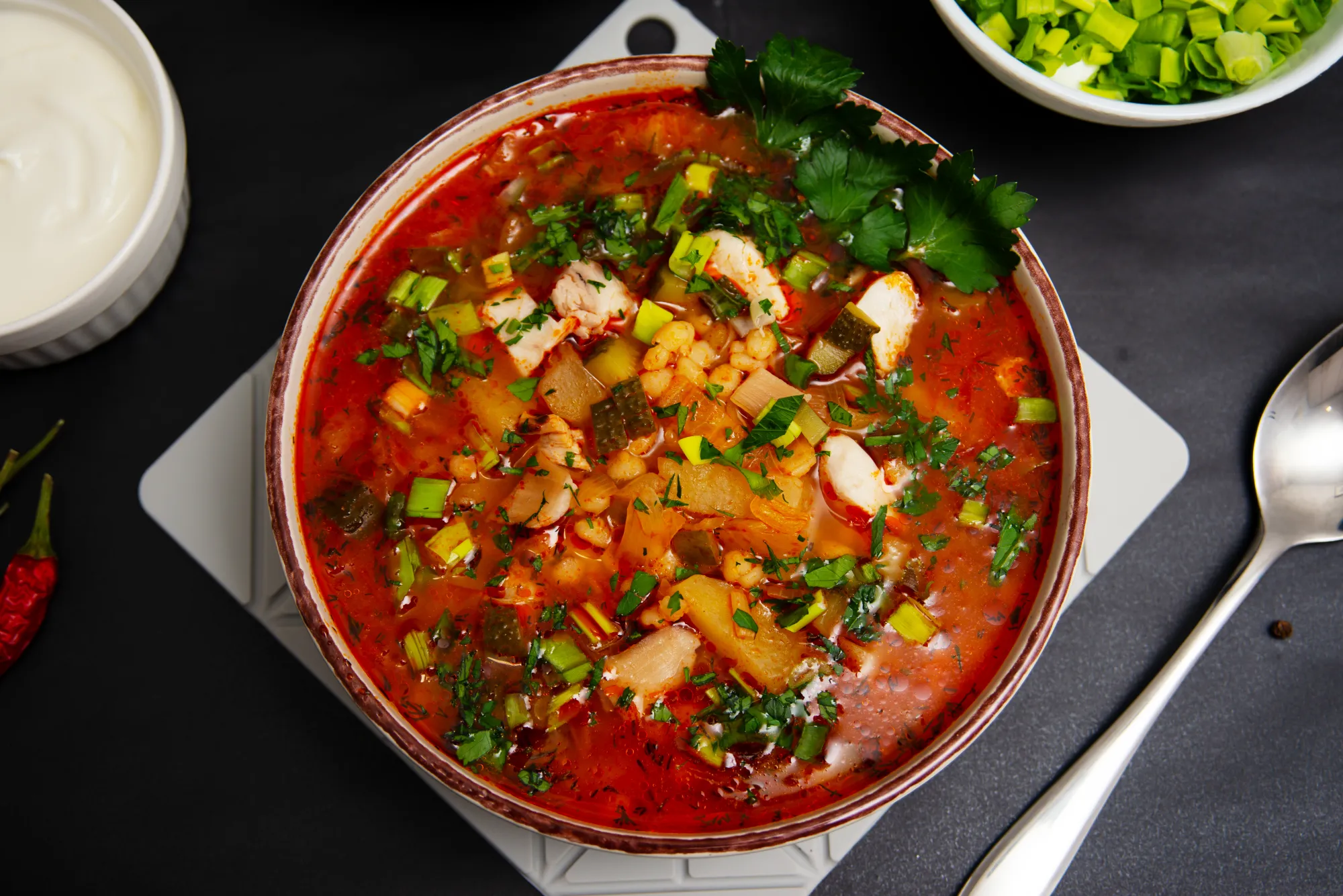 Подаём обязательно с зеленью и сметаной.