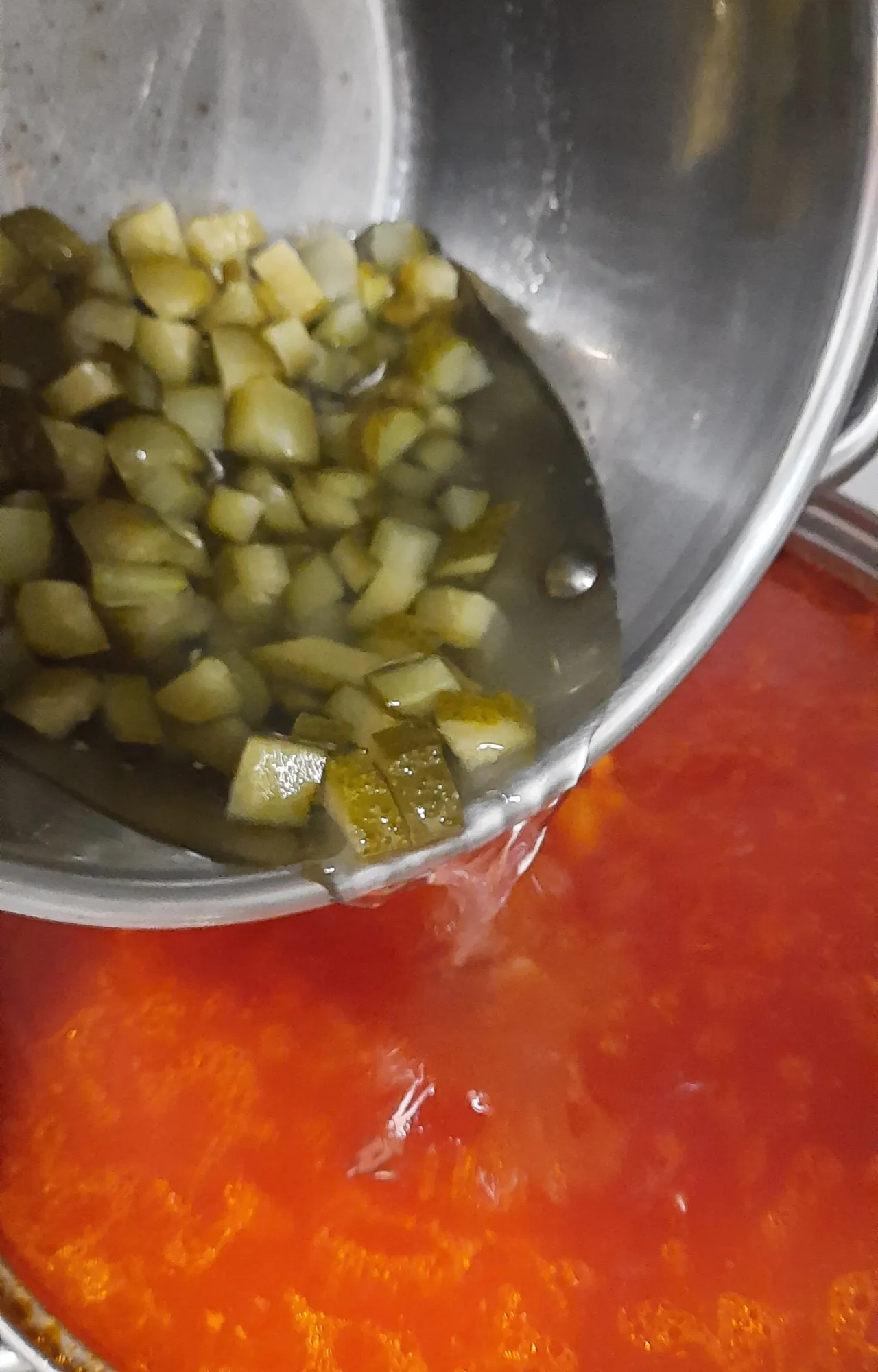 Снова даём закипеть. И добавляем перловку, мясо и огурцы. Огурцы добавляем прямо вместе с той жидкостью, в которой они бланшировались