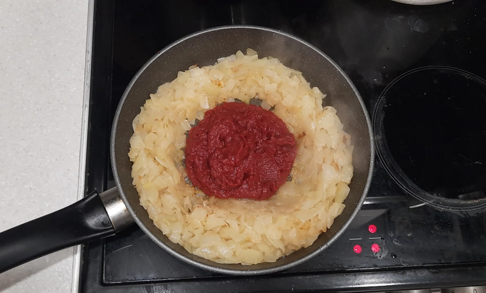 Делаем это до золотистости лучка. Затем лопаткой сдвигаем лук к краям сковороды. На середину вываливаем томатную пасту. Немного прижариваем и помешиваем её в центре сковороды, чтобы убрать землистый привкус.