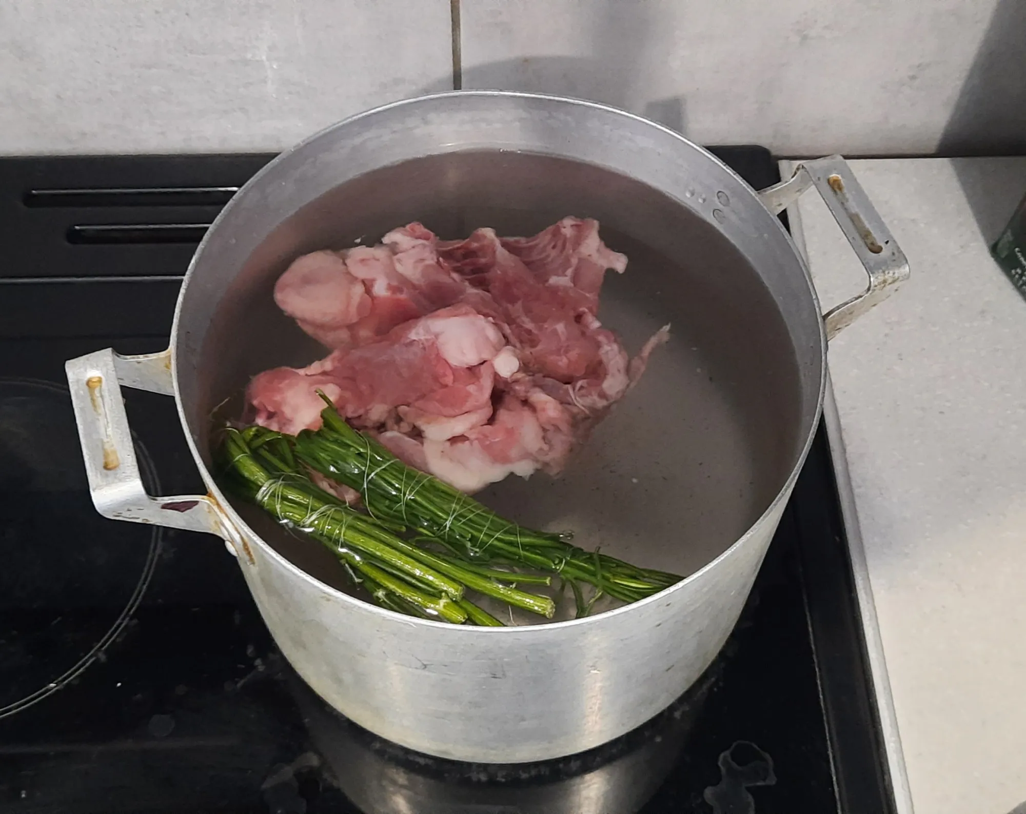 Заливаем суповой набор с солью и стеблями 3-3,5 литра воды и доводим до кипения.