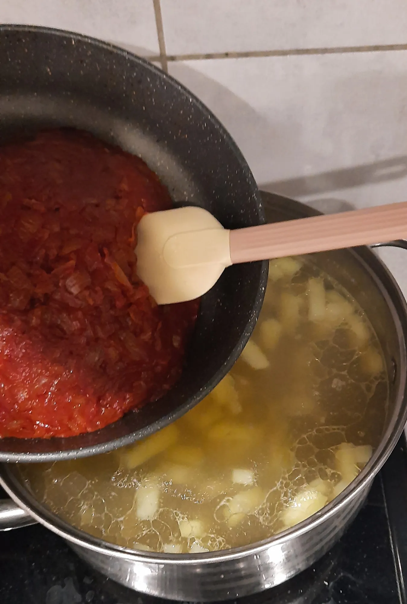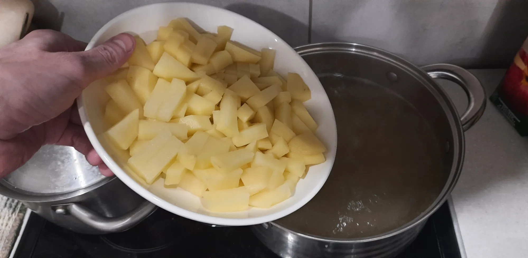 Чистый бульон в нормальной кастрюле вновь доводим до кипения. Отправляем туда картофель