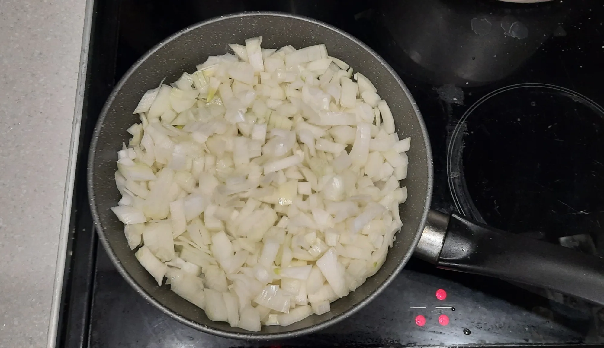 Разогреваем на сковороде растительное масло и начинаем пассеровать лук. На среднем огне.